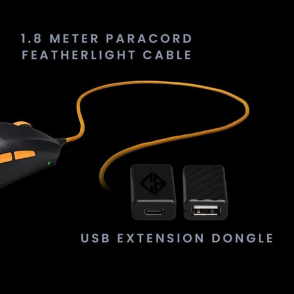 PTFE mouse feet for low-friction glide, 500mAh rechargeable battery, customizable via software, and 1.8m paracord featherlight cable with USB extender.