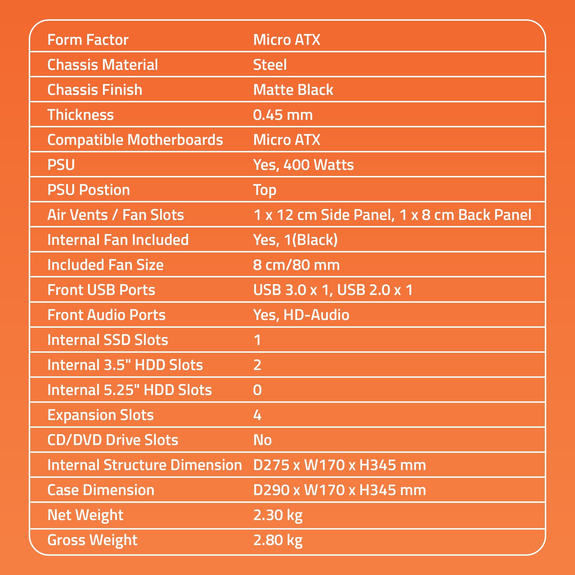 2620 3.0C Cabinet supports Micro ATX Motherboards. It also has front USB & HD- Audio port and comes with 400 Watt Power Supply. 80 mm fan Included. Computer Chassis Cabinet for Micro ATX Motherboard. 0.45 mm Thickness, Steel Chassis & Matte Black Material. Air Vents / Fan Slots: 1x 12 cm Side Panel, 1 x 8cm Back Panel. 8 cm fan Included. Front USB Ports:USB 3.0 x 1 & USB 2.0 x 1 .Front Audio Port: HD- Audio Position Top with 400 Watts Power Supply Included. Internal SSD Slots: 1, 3.5” HDD Slots: 2 & Expansion Slots: 4