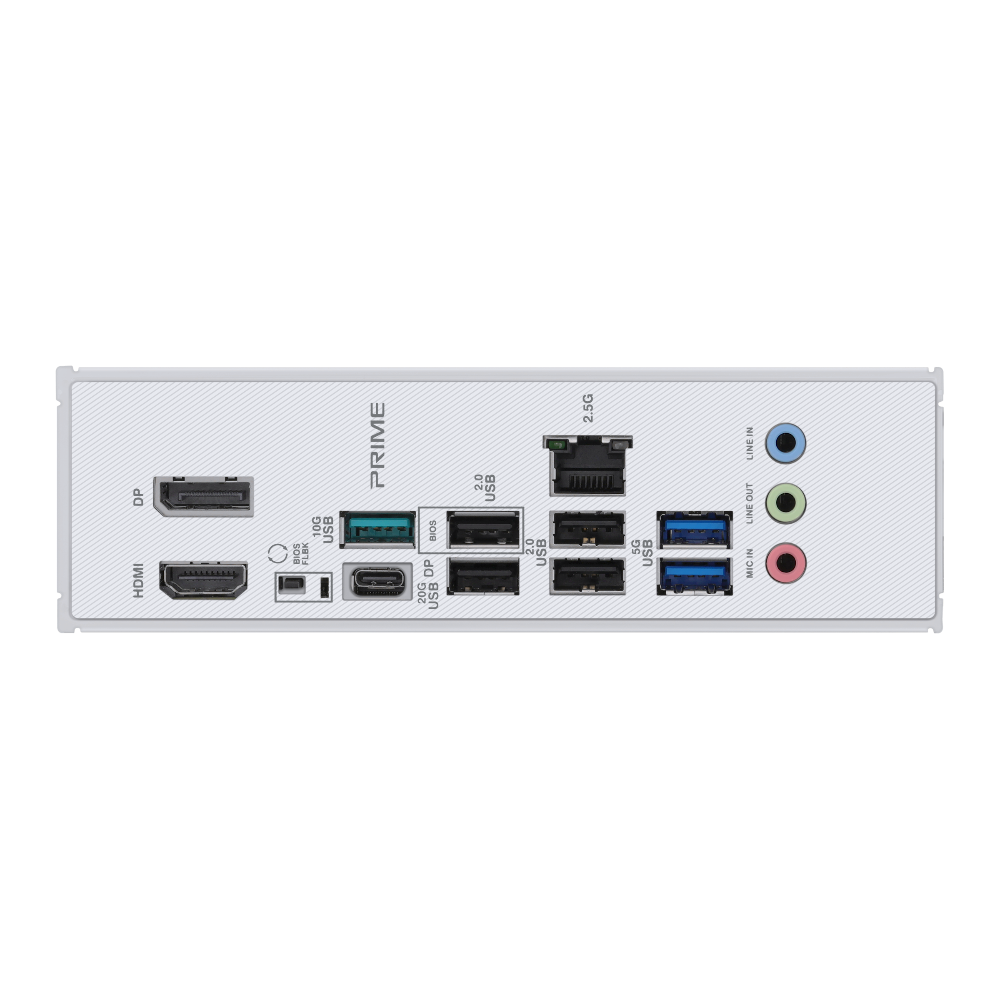 | Back Panel I/O Ports | 1 x USB 20Gbps port (1 x USB Type-C® with DP Alt mode) 1 x USB 10Gbps port (1 x Type-A) 2 x USB 5Gbps ports (2 x Type-A) 4 x USB 2.0 ports (4 x Type-A) 1 x DisplayPort 1 x HDMITM port 1 x Realtek 2.5Gb Ethernet port 3 x Audio jacks 1 x BIOS FlashBack™ button |