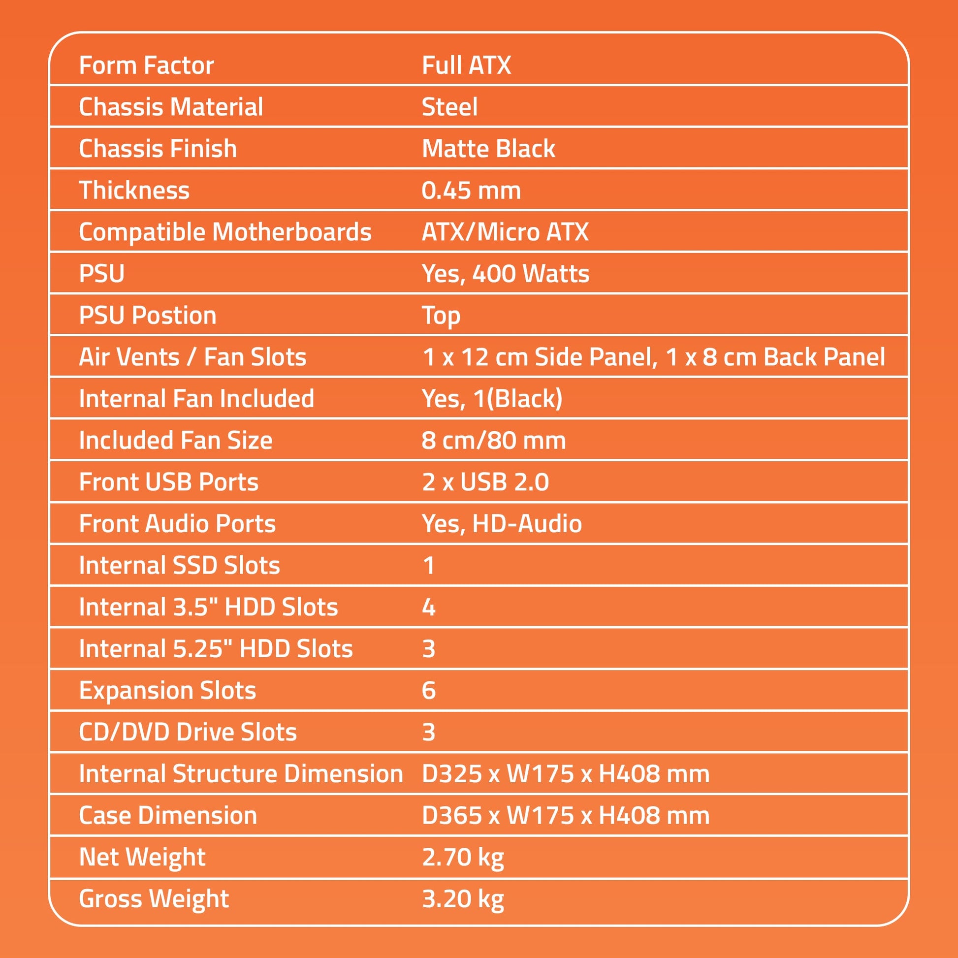 SPARK 2.0 Cabinet supports Full ATX / Micro ATX Motherboards. It also has front top USB & HD- Audio port and comes with 400 Watt Power Supply. 80 mm fan Included. Computer Chassis Cabinet for Full ATX /Micro ATX Motherboard.0.45 mm Thickness, Steel Chassis & Matte Black Material. Air Vents / Fan Slots : 1x 12 cm Side Panel , 1 x 8cm Back Panel. 8 cm fan Included. Front USB 2.0 Ports : 2. Front Audio Port: HD- Audio. PSU Position Top with 400 Watts Power Supply Included. Internal SSD Slots: 1 , 3.5” HDD Slots: 4 & 5.25” HDD Slots:3 , Expansion Slots:6.