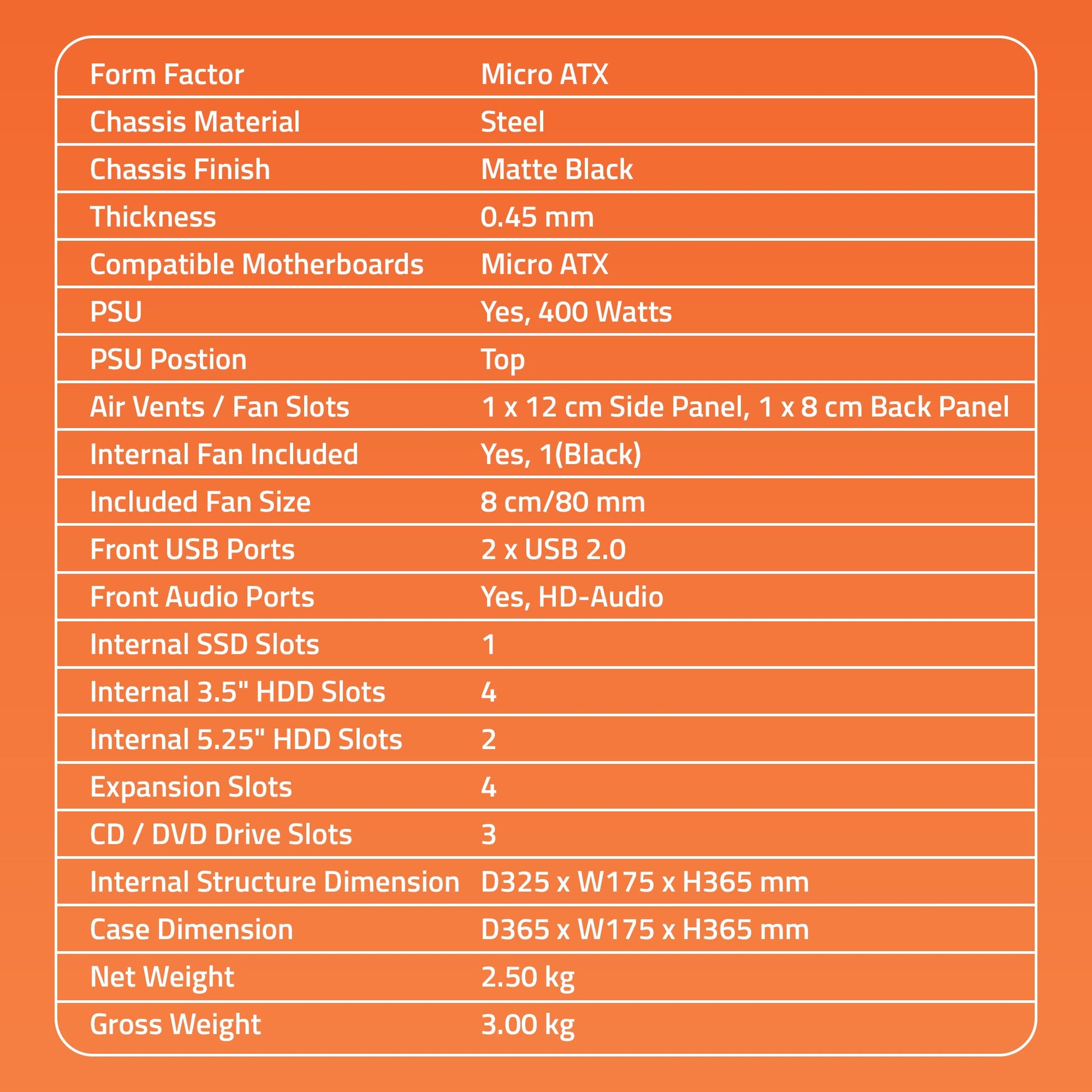 Spirit 2.0 Cabinet supports Micro ATX Motherboards. It also has front top USB & HD- Audio port and comes with 400 Watt Power Supply. 80 mm fan Included.Computer Chassis Cabinet for Micro ATX Motherboard. 0.45 mm Thickness, Steel Chassis & Matte Black Material. Air Vents / Fan Slots : 1x 12 cm Side Panel , 1 x 8cm Back Panel. 8 cm fan Included. Front USB 2.0 Ports : 2. Front Audio Port: HD- Audio. PSU Position Top with 400 Watts Power Supply Included. Internal SSD Slots: 1 , 3.5” HDD Slots: 4 & 5.25” HDD Slots:2 , Expansion Slots:4