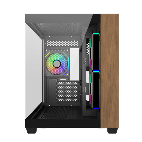 The PA602 Wood Edition features an open front grille with high porosity to maximize airflow and ventilation. Meanwhile, extra-thick PWM fans yield very high airflow and pleasant acoustics, and pre-installed dual air deflectors work in concert to help centralize cool air for both graphics cards and CPU cooler air intake, enhancing cooling efficiency for the whole system.