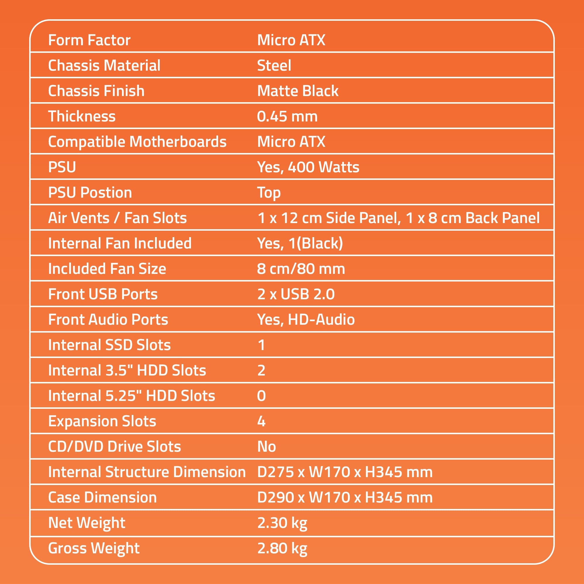 2620 2.0 C Cabinet supports Micro ATX Motherboards. It also has front USB & HD- Audio port and comes with 400 Watt Power Supply. 80 mm fan Included. Computer Chassis Cabinet for Micro ATX Motherboard. 0.45 mm Thickness, Steel Chassis & Matte Black Material. Air Vents / Fan Slots: 1x 12 cm Side Panel, 1 x 8cm Back Panel. 8 cm fan Included. Front USB Ports: 2 X USB 2.0 .Front Audio Port: HD- Audio Position Top with 400 Watts Power Supply Included. Internal SSD Slots: 1, 3.5” HDD Slots: 2 & Expansion Slots: 4