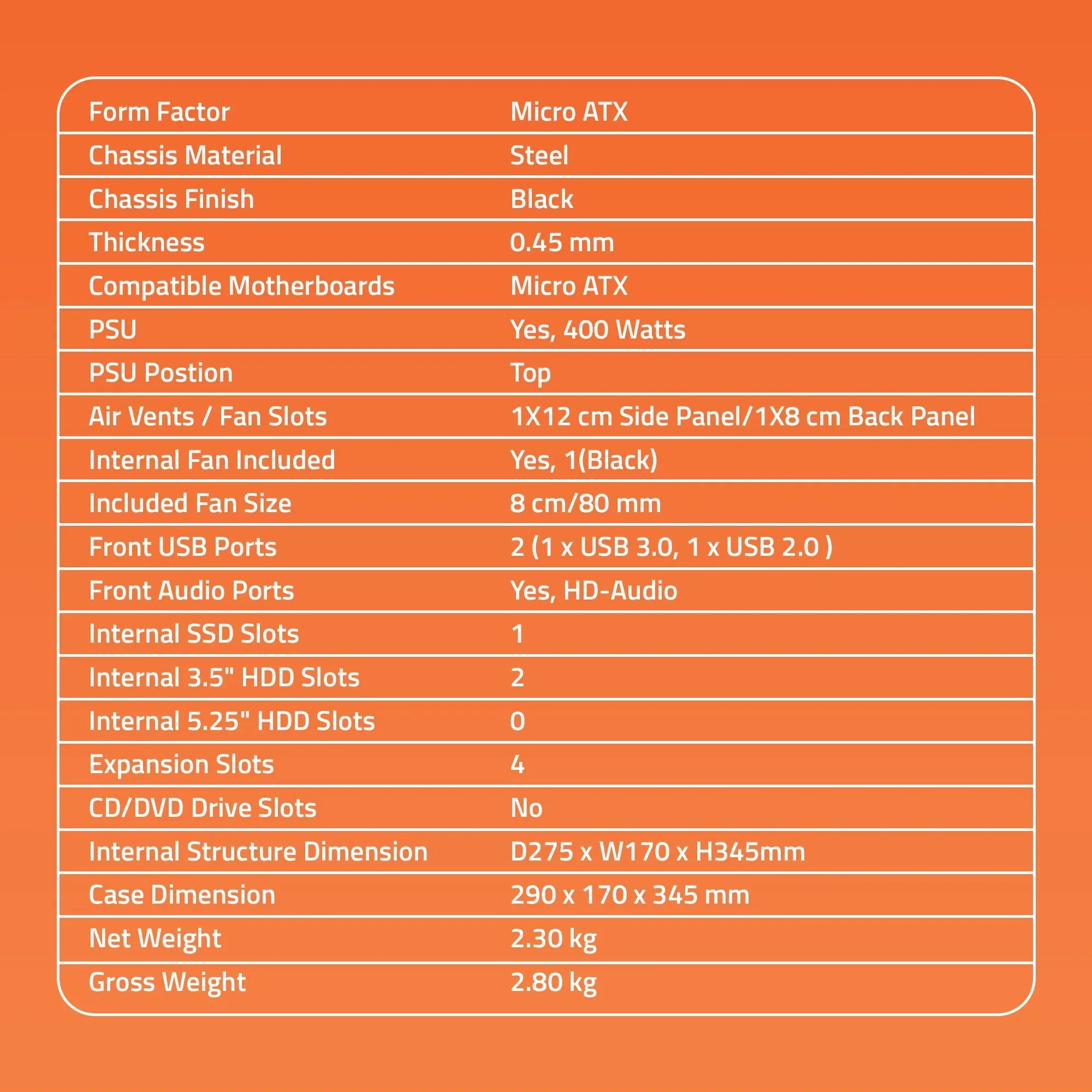 2820 3.0 Cabinet supports Micro ATX Motherboard comes with 400 Watt Power Supply with 80 mm fan Included. It also has front USB & HD- Audio port. Computer Chassis Cabinet for Micro ATX Motherboard. 0.45 mm Thickness, Steel Chassis & Matte Black Material. Air Vents / Fan Slots: 1x 12 cm Side Panel, 1 x 8cm Back Panel. 8 cm fan Included. Front USB Ports: USB 2.0 x 1 & USB 3.0 x 1.Front Audio Port: HD- Audio. SMPS Position Top. Internal SSD Slots: 1, 3.5” HDD Slots: 2 & Expansion Slots: 4 , INTERNAL STRUCTURE DIMENSION : D275*W170*H345MM, CASE DIMENSION: D290*W170*H345MM