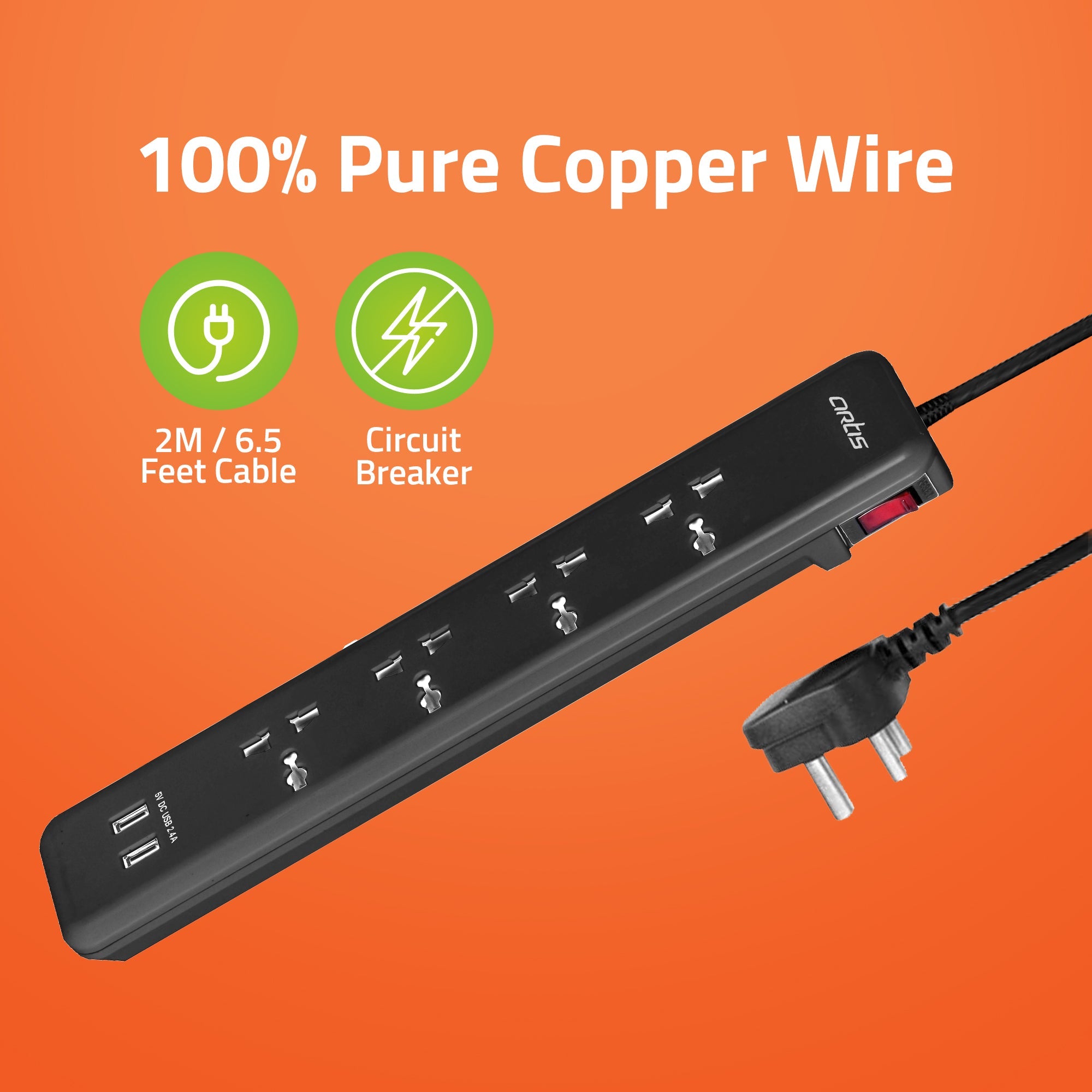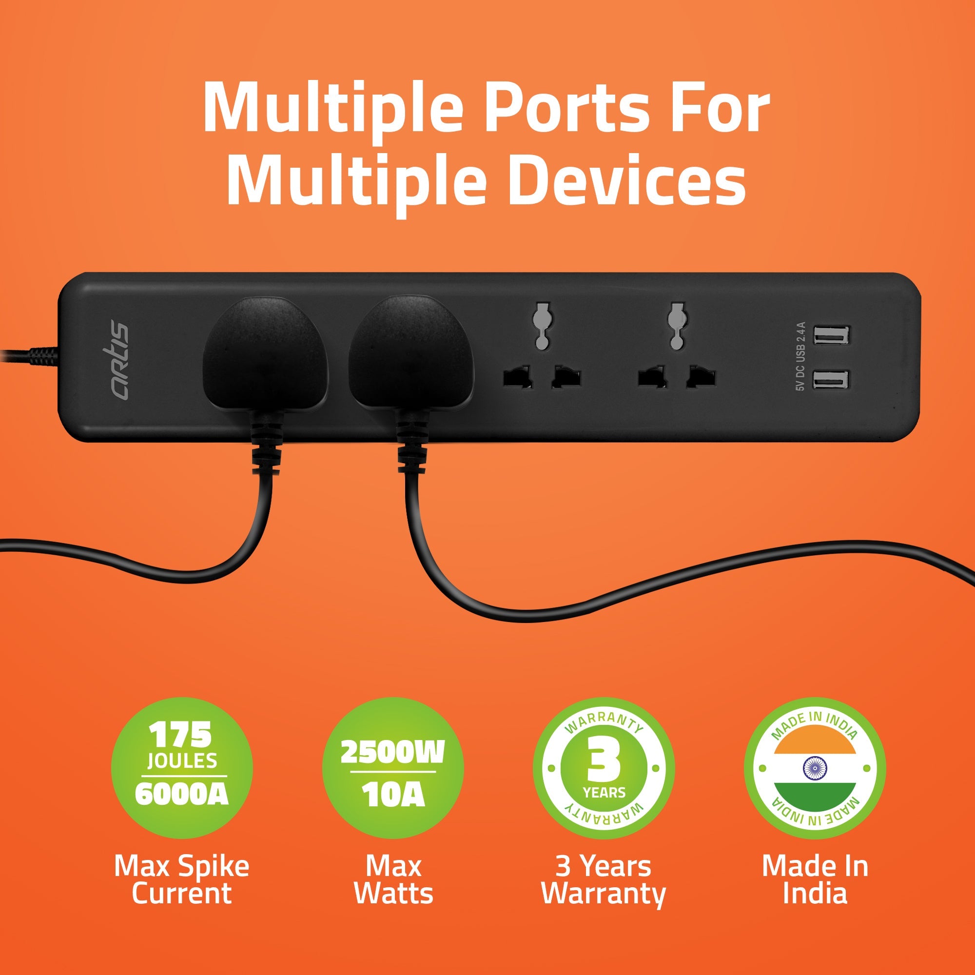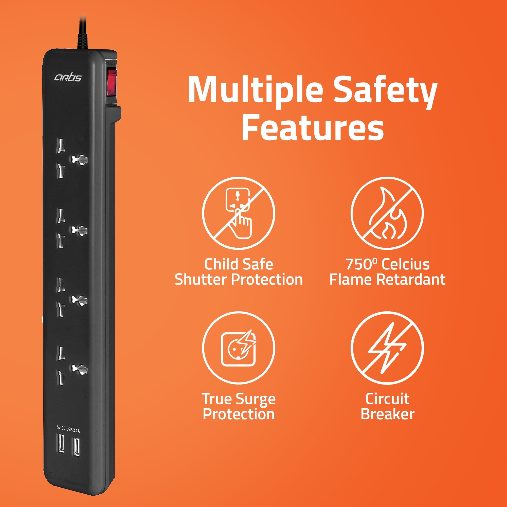 Artis AR-4SSU-CB 4 Universal Sockets & 2 USB single switch, child safe shutter Protection. The Artis Surge protector is a product to protect your Home / Office electrical equipment’s against power Surge & Spike. Multipurpose Universal socket with high quality housing material.