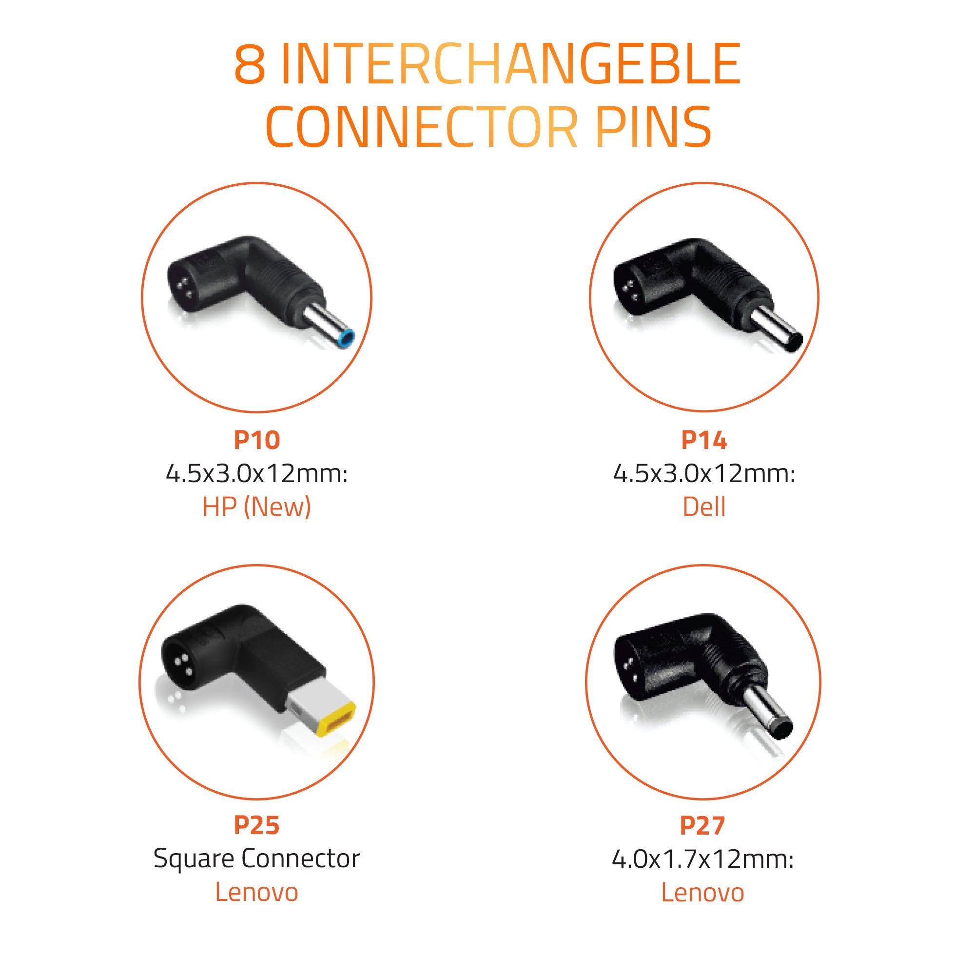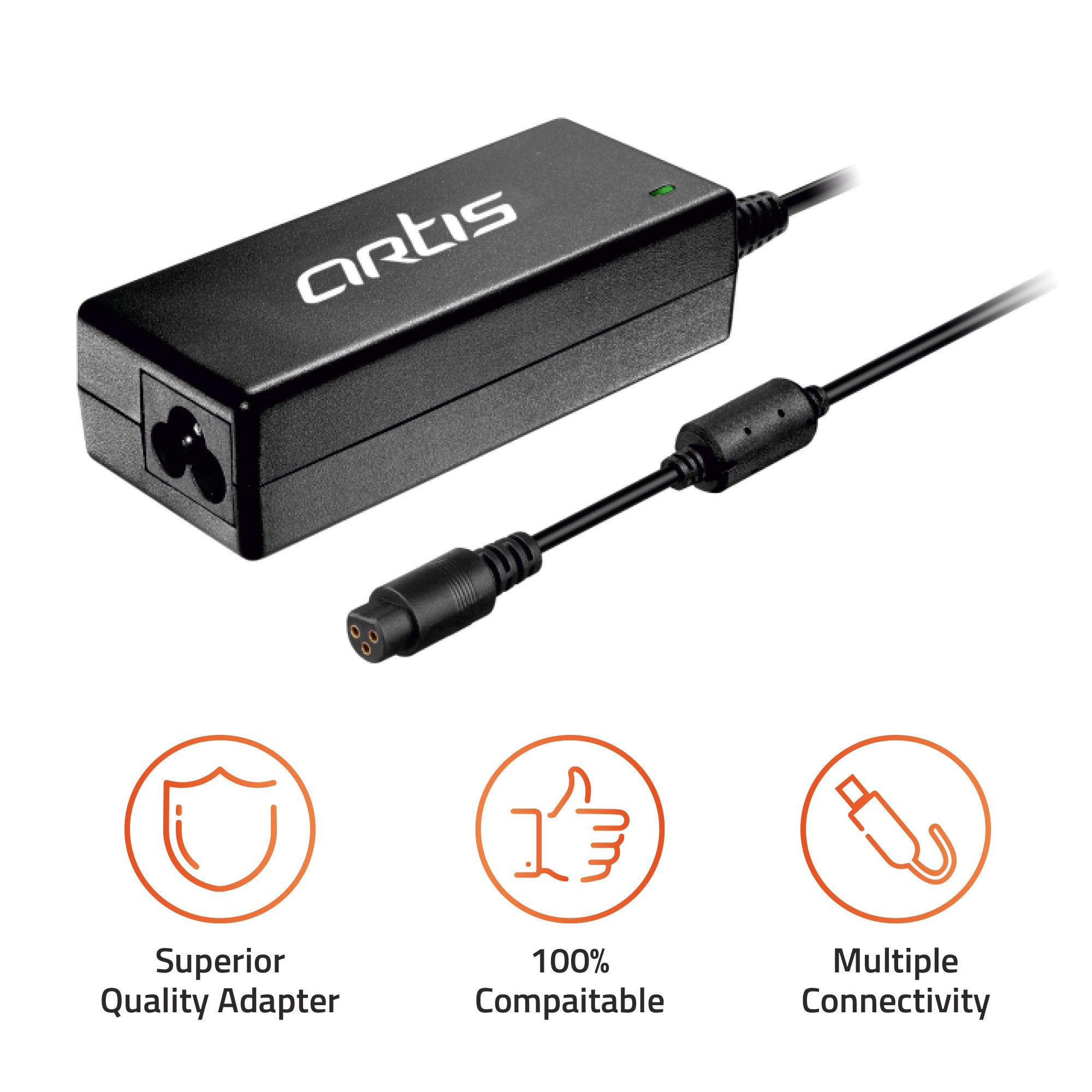 Artis 65W Universal Laptop Adapter with 8 interchangeable connector pins for compatibility with a variety of laptops. 65W Universal Laptop Adapter, 8 Interchangeable Connector Pins, Regulates Output Voltage Automatically, Short Circuit / Overload / Over voltage / Over Voltage Protection, CE, FCC, ROHS Compliant