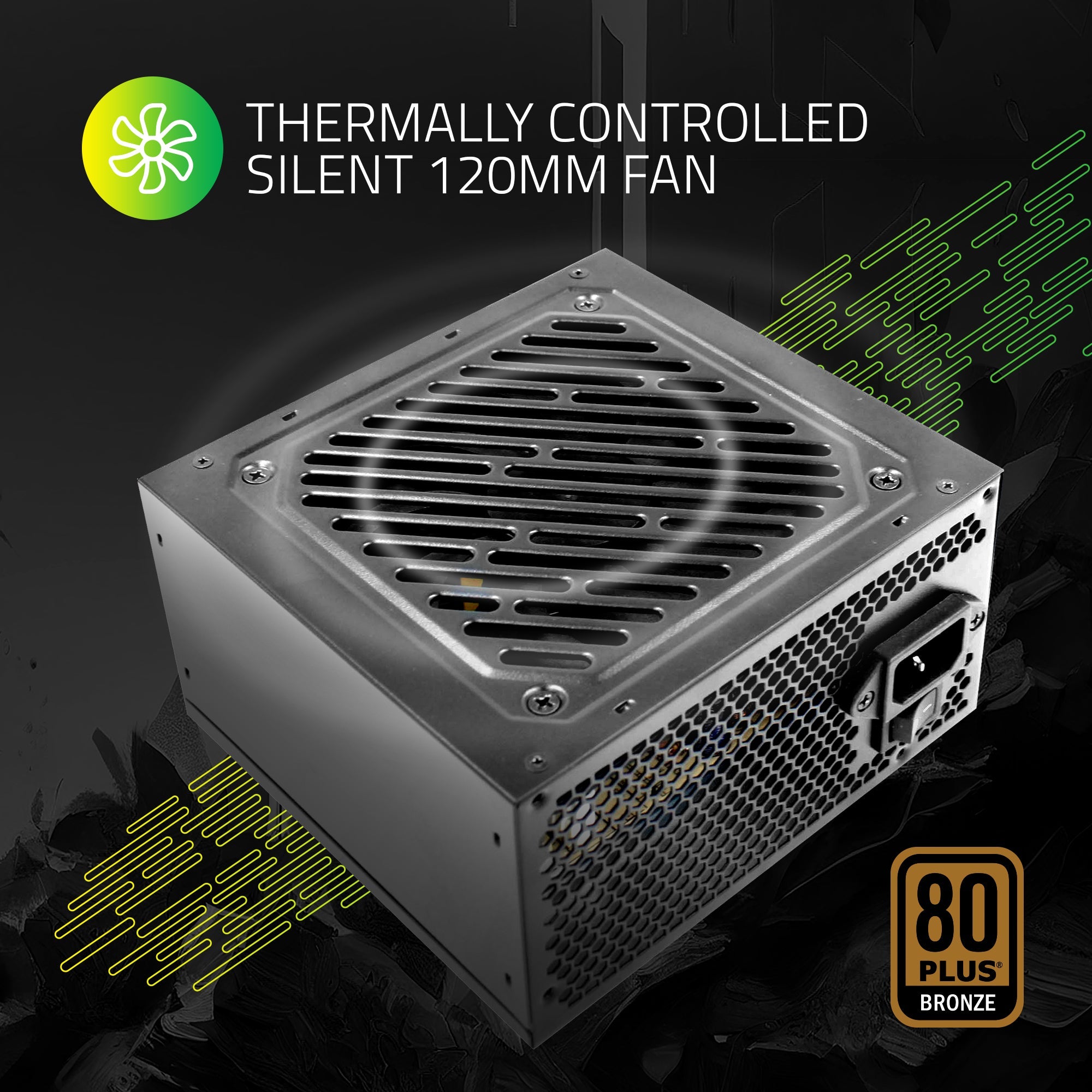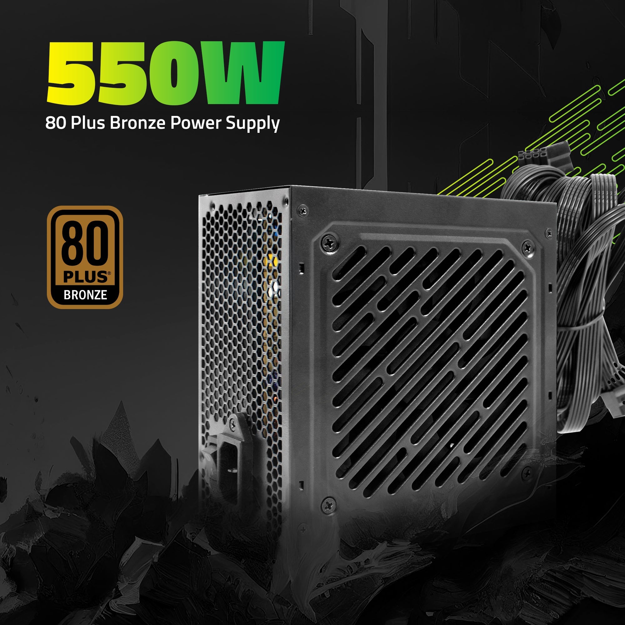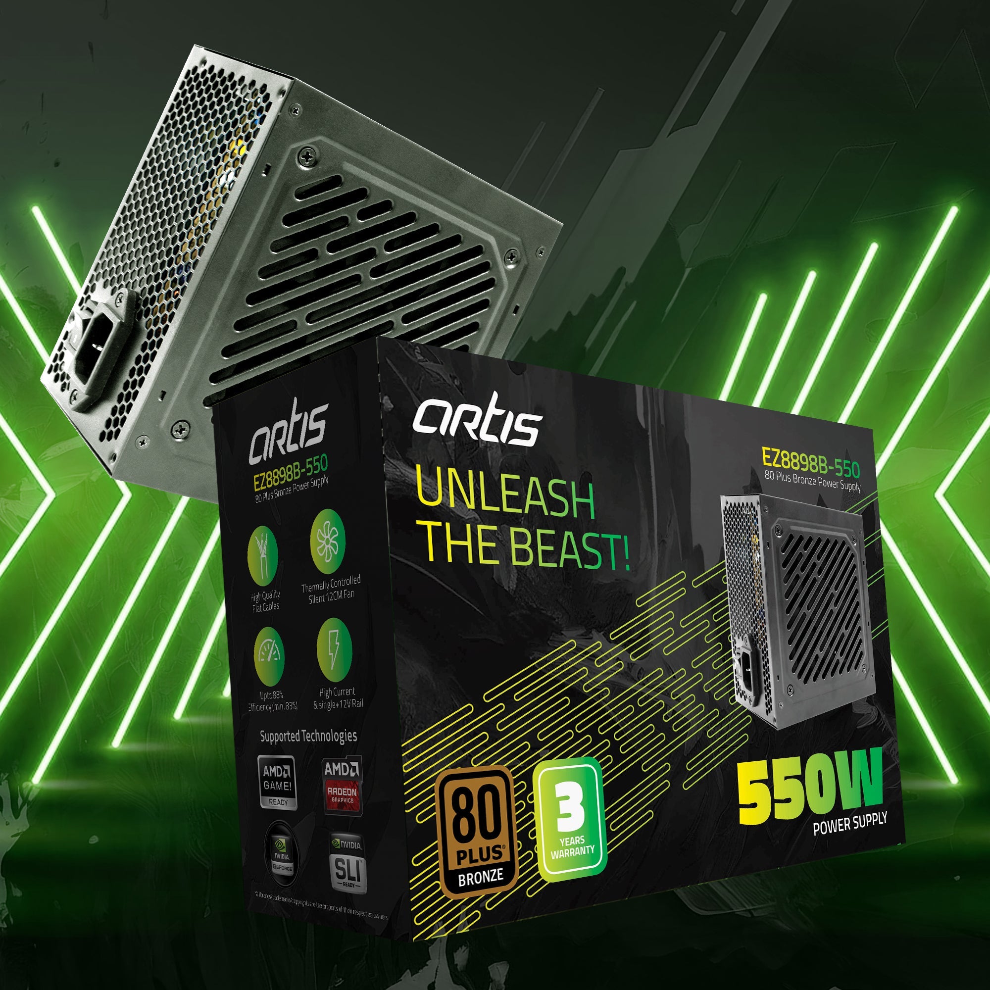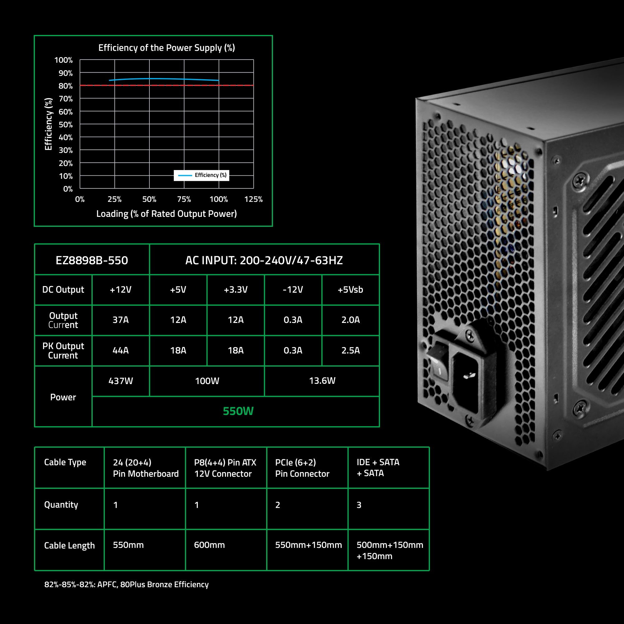 EZ8898B-550 Watt 80 plus Bronze Power Supply Unit. 12cm Smart Temperature Control Fan with speed control for excellent thermal control, Up to 88% High efficiency protection( Min.83% ), PCI-E Ready for compatibility with NVIDIA and Intel/AMD graphic cards. Multi-Level Protections: Over Voltage, Under Current Voltage, Short Circuit Protection. Single +12V Rail ensures consistent output.
