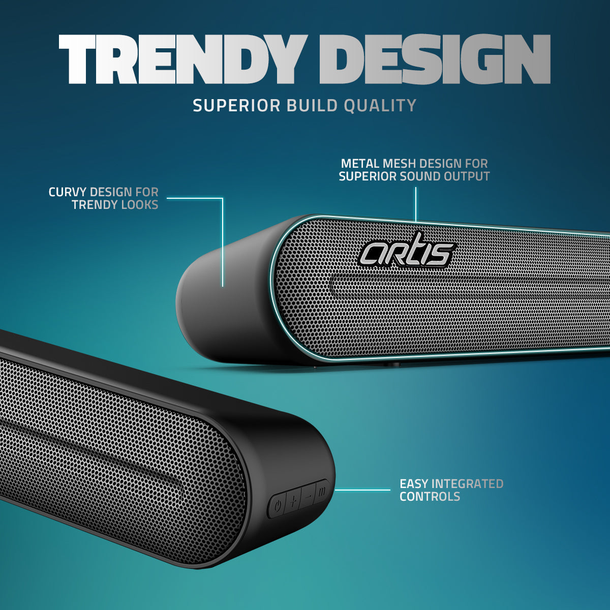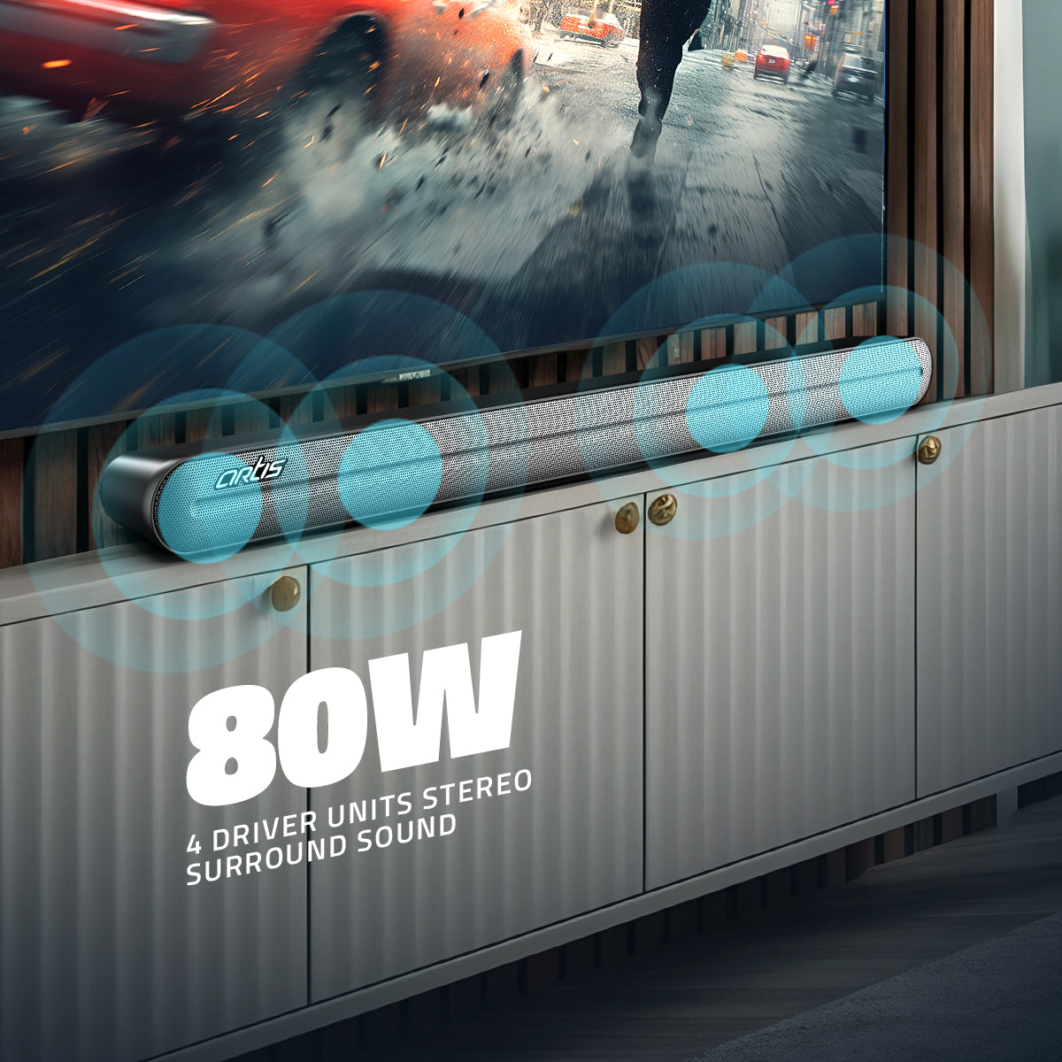 The Artis BT X5 Sound Bar raises the "bar" of giving you immersive & cinematic sound in an ideal room friendly size. The 4 Driver units along the length of the bar, 2 passive radiators and inbuilt amplifier help truly provide a 2.0 channel 3D surround sound experience! The ultra-sleek and stylish design of the sound bar supports both wall mount and table top installations hence allowing you to discreetly place it in front or below a LCD / LED TV without obscuring the screen and seamlessly integrate with your existing furniture. Enhance your viewing experience with superior bass & clear sound. The 80W RMS Output from this size of Sound Bar is unparalleled in the industry. The 3 EQ pre-sets let you customize the output to your liking: Music, Movie or Speech. Transport yourself into another realm with the 3D Surround sound mode. X5 gives Bluetooth 5.0 wireless connectivity and comes with a multi-function wireless remote control for ease of use. Bluetooth mode lets you enjoy music by wirelessly streaming from your mobile devices such as smartphones, tabs or any other Bluetooth device. Multiple input modes such as Bluetooth, Aux in, HDMI (ARC), Optical or USB make it ideal for any input device. It’s a stylish yet powerful Sound Bar for your home environment!!