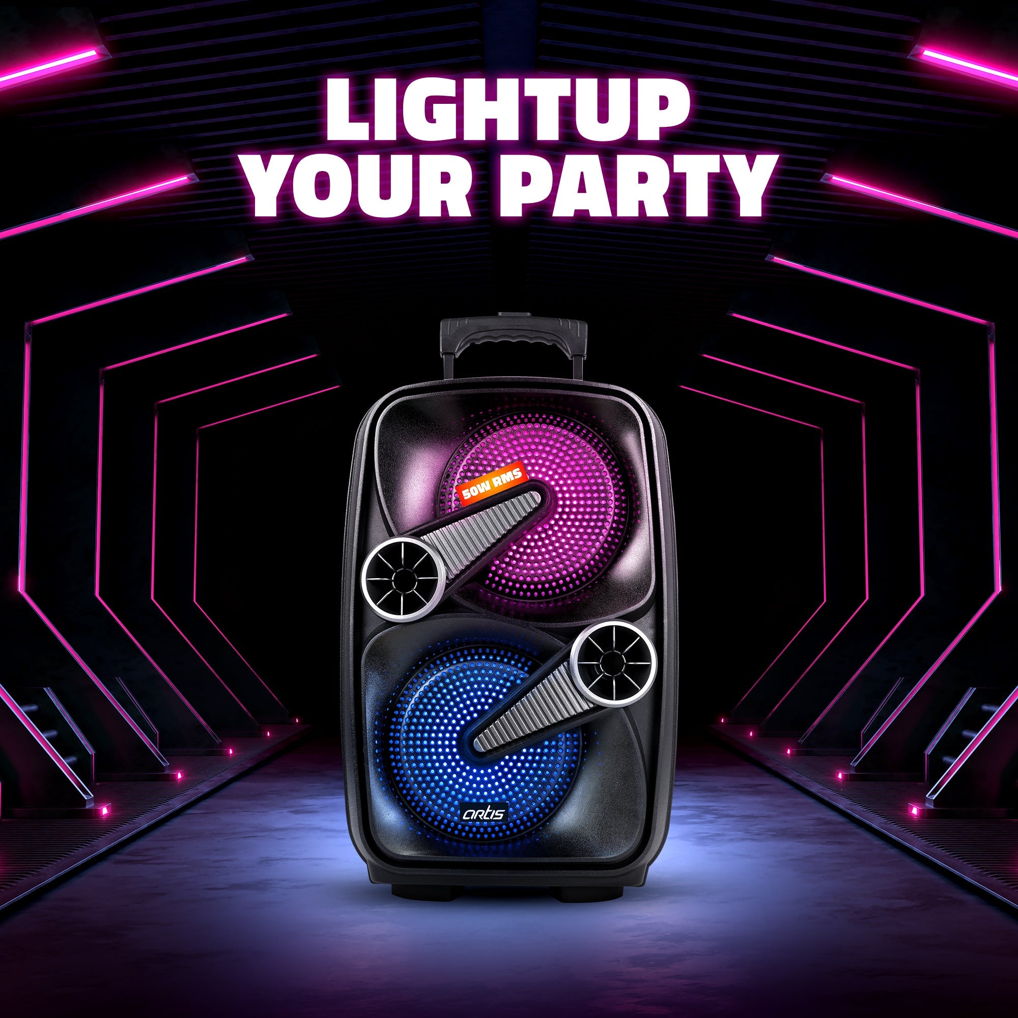 BT909 50W Portable Bluetooth Party Speaker with 1800 mAh Battery. It is also use as an Outdoor Bluetooth Party Speaker with RGB LED Light Display. This speaker is ideal for parties and large gatherings or large spaces. The Wireless Mic Can be used to sing along with music .True Wireless Stereo is a feature that lets two speakers that are TWS enabled interconnect and create a better stereo system.