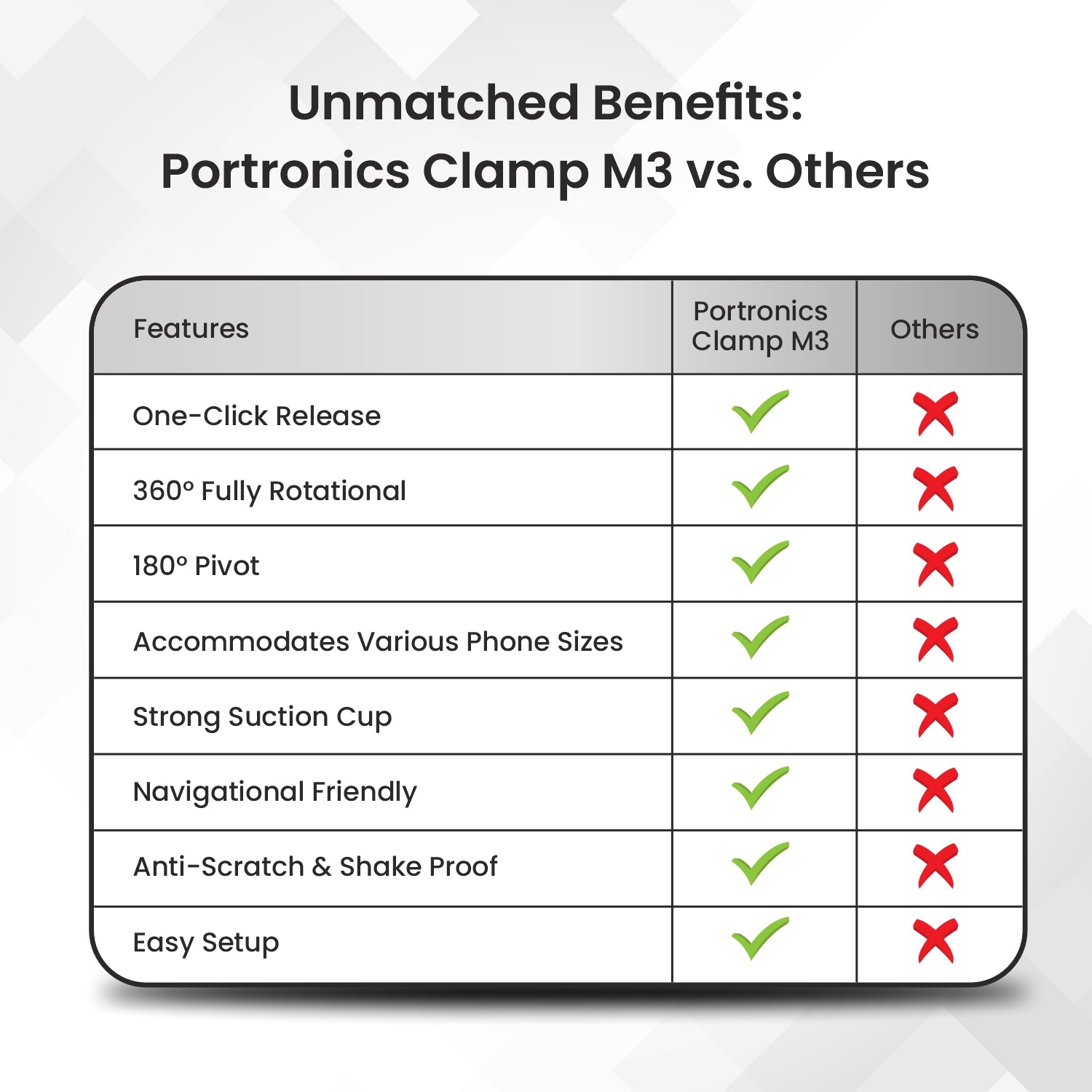 - Perfect 2 in 1 Driving Partner: Secure your mobile while driving with Portronics Clamp M3 Car Mobile Holder. Whether you drive a car, truck, SUV, or taxi, this 2-in-1 holder attaches to your windshield or dashboard with its powerful gel suction cup.
