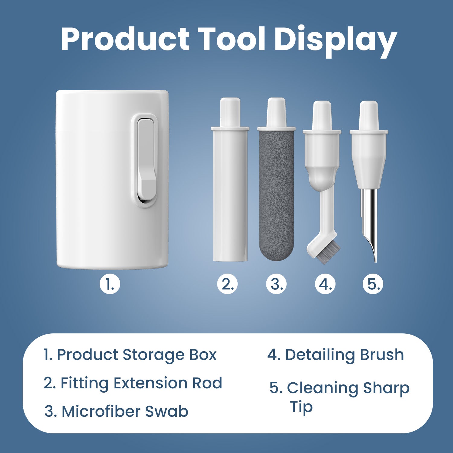 - 5-in-1 Multifunctional Cleaning Kit: This comprehensive set includes a product storage box, fitting extension rod, flock sponge, small curved brush, and precision pen nib, providing everything you need for deep and thorough cleaning of your electronic devices.