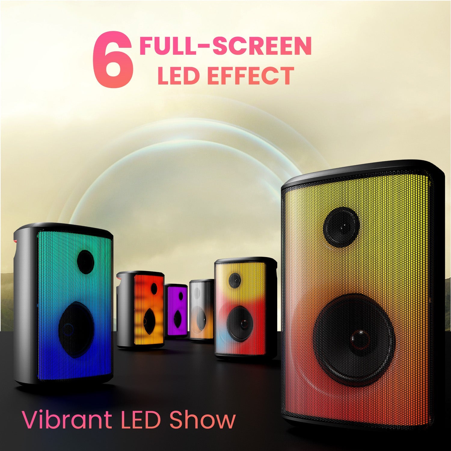 • 6 Full Panel LED Effects: This party speaker's high bass and sound are accompanied by colorful LED RGB lights that cover the entire panel creating a captivating audio-visual feast & elevating the atmosphere of the party. You can select from 6 different light modes using the integrated control panel.