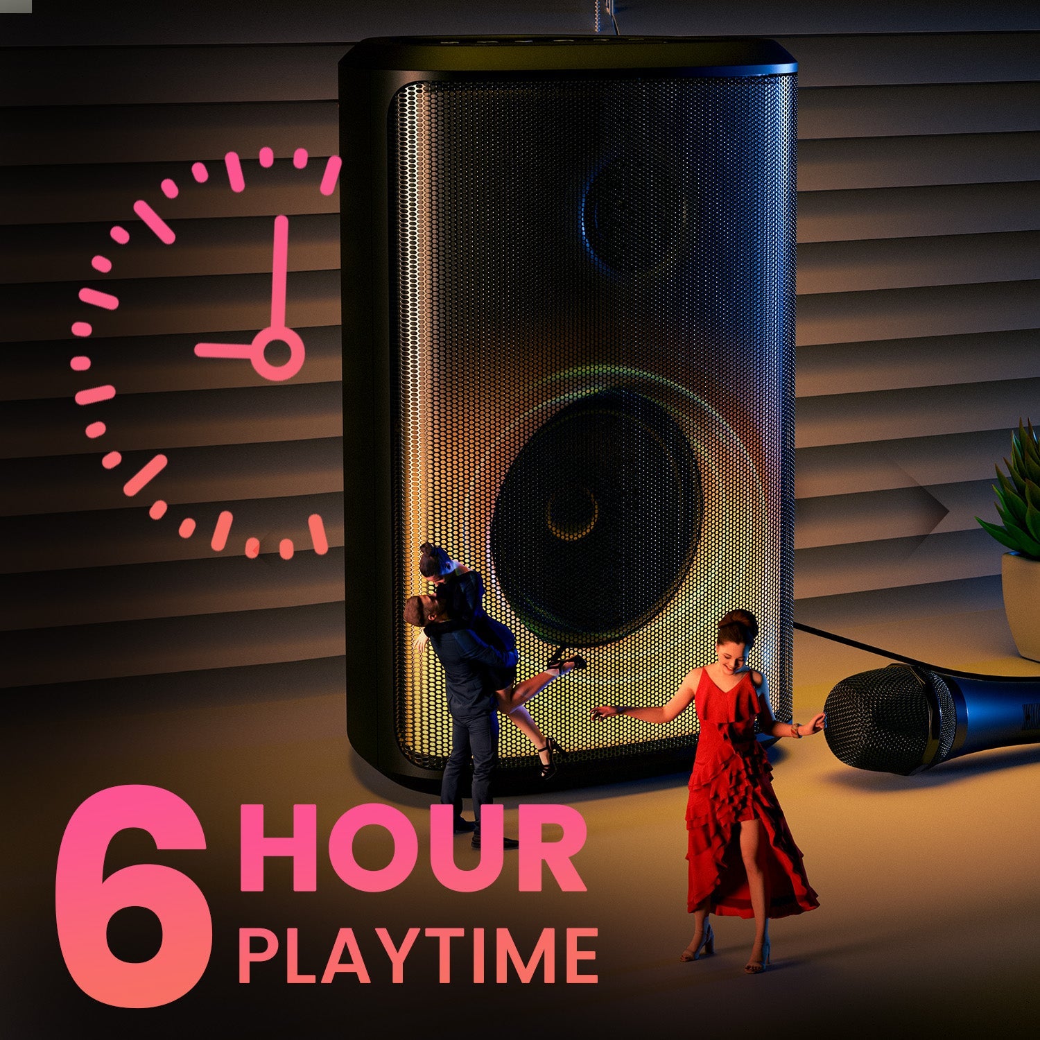 • Long Playtime and Type-C Charging: This karaoke speaker with mic system has a large battery capacity providing an incredible 6 hours of playtime. When it starts running out of battery, you can fast charge it using the included type-C cable and keep your party going for hours.