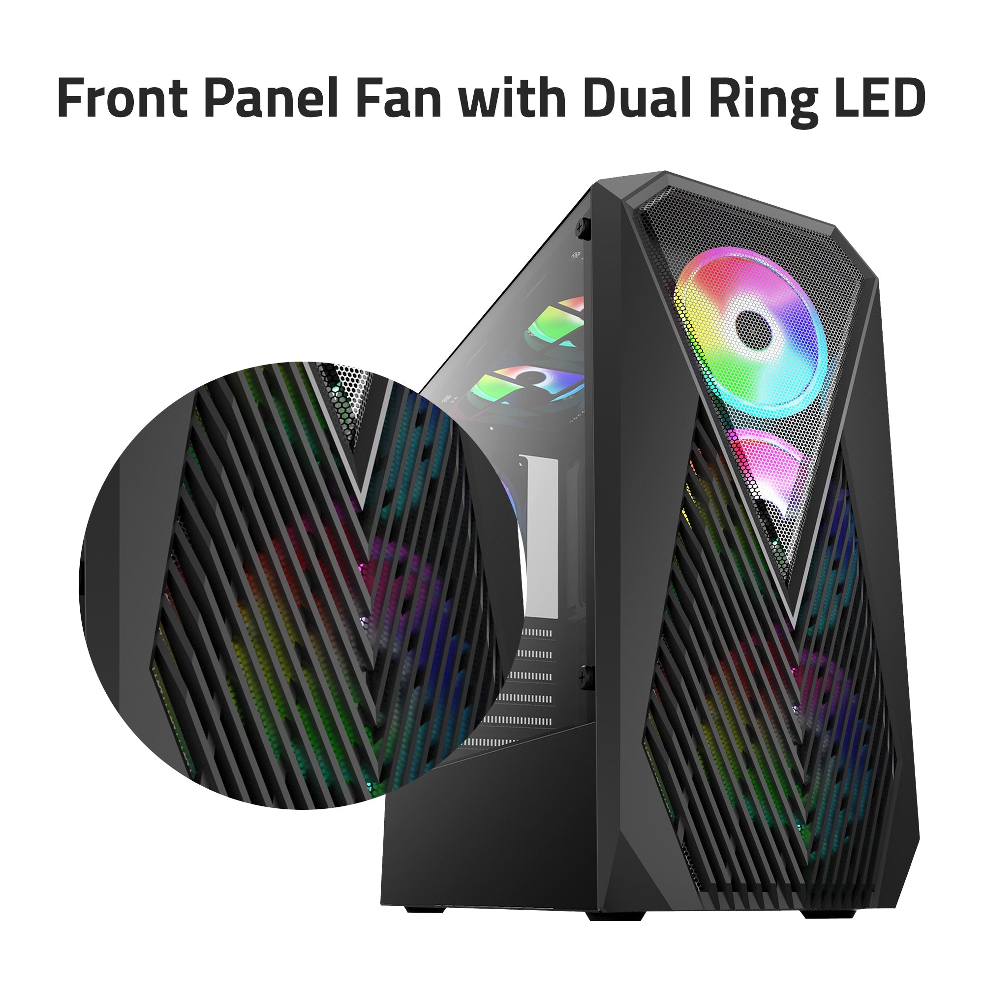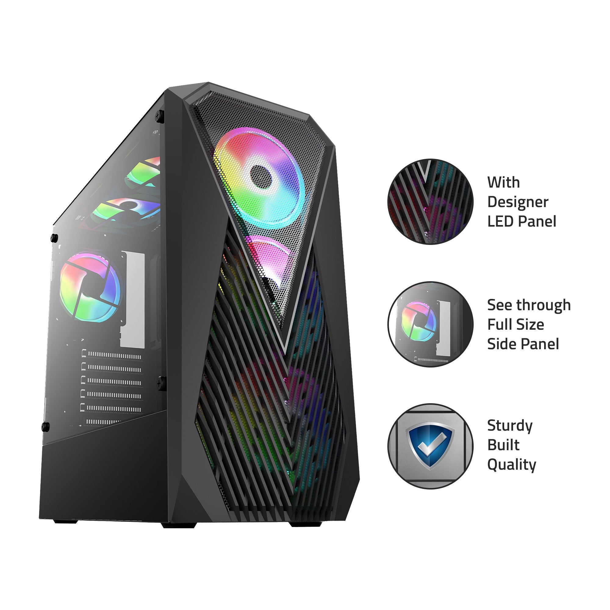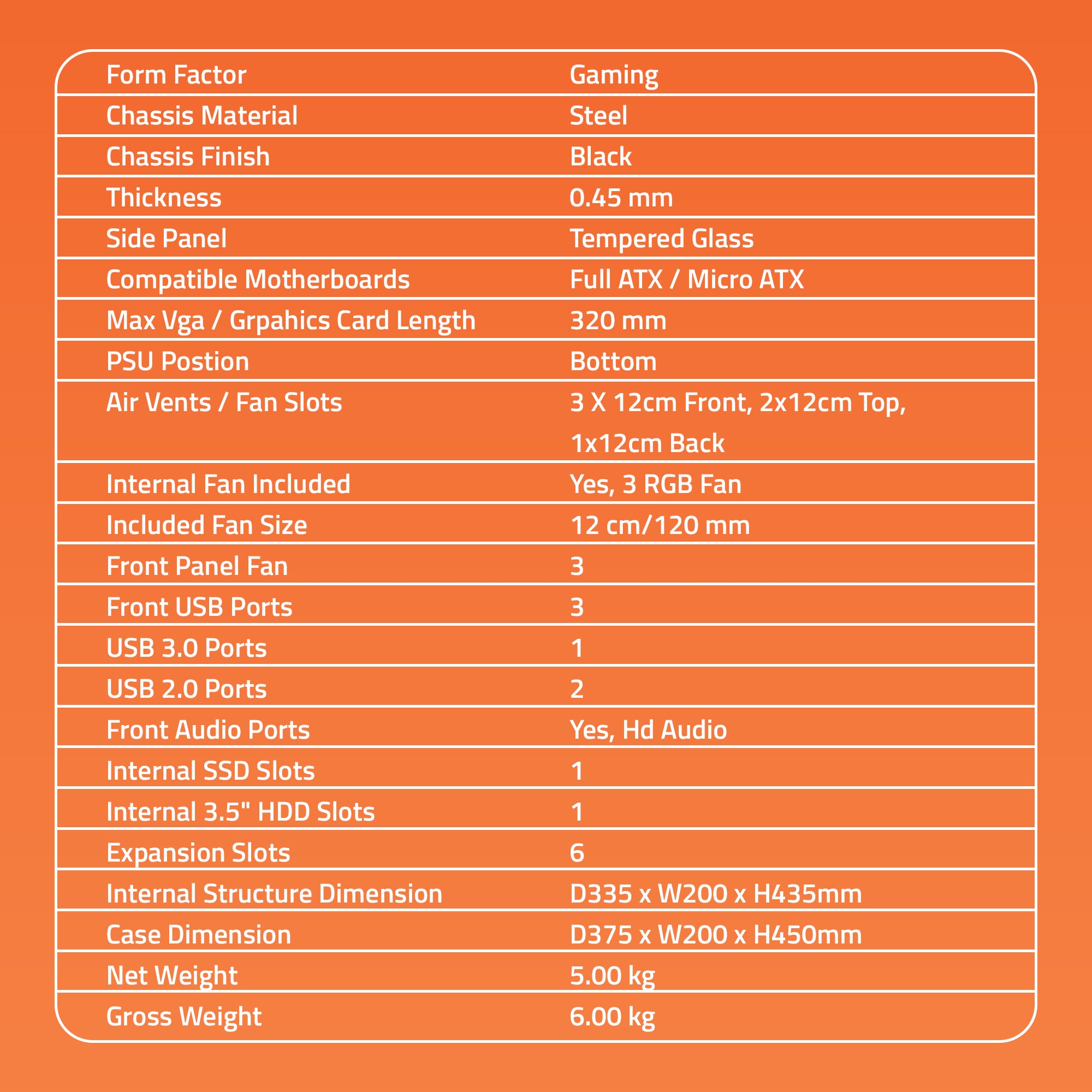G8023 Computer Gaming Cabinet support Full ATX, Micro ATX Motherboard, 3 x RGB Fan with Sturdy built Quality. PSU Placement: Bottom ,USB 3.0: 1 USB 2.0: 2 . HD Audio: Yes Side Panel: Yes, Tempered Glass , SSD Slots: 1 , HDD Slots: 1 , Front Panel Fan: 3 x 12 cm Fan ,Top Panel Fan: 2x12 cm & Back Panel Fan : 1x 12 cm .Fan Size: 120mm/12 cm . Max. VGA/Graphics Card Length: 320 mmc
