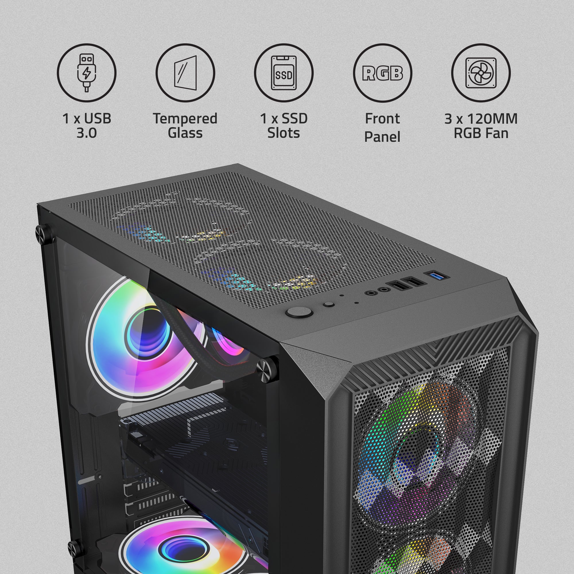 G8322B Computer Gaming Cabinet support Full ATX, Micro ATX Motherboard, 3 x RGB Fan with Sturdy built Quality. PSU Placement: Bottom ,USB 3.0: 1 USB 2.0: 2 . HD Audio: Yes Side Panel: Yes, Tempered Glass , SSD Slots: 1 , HDD Slots: 1 , Front Panel Fan: 3 x 12 cm Fan ,Top Panel Fan: 2x12 cm & Back Panel Fan : 1x 12 cm .Fan Size: 120mm/12 cm . Max. VGA/Graphics Card Length: 305 mm