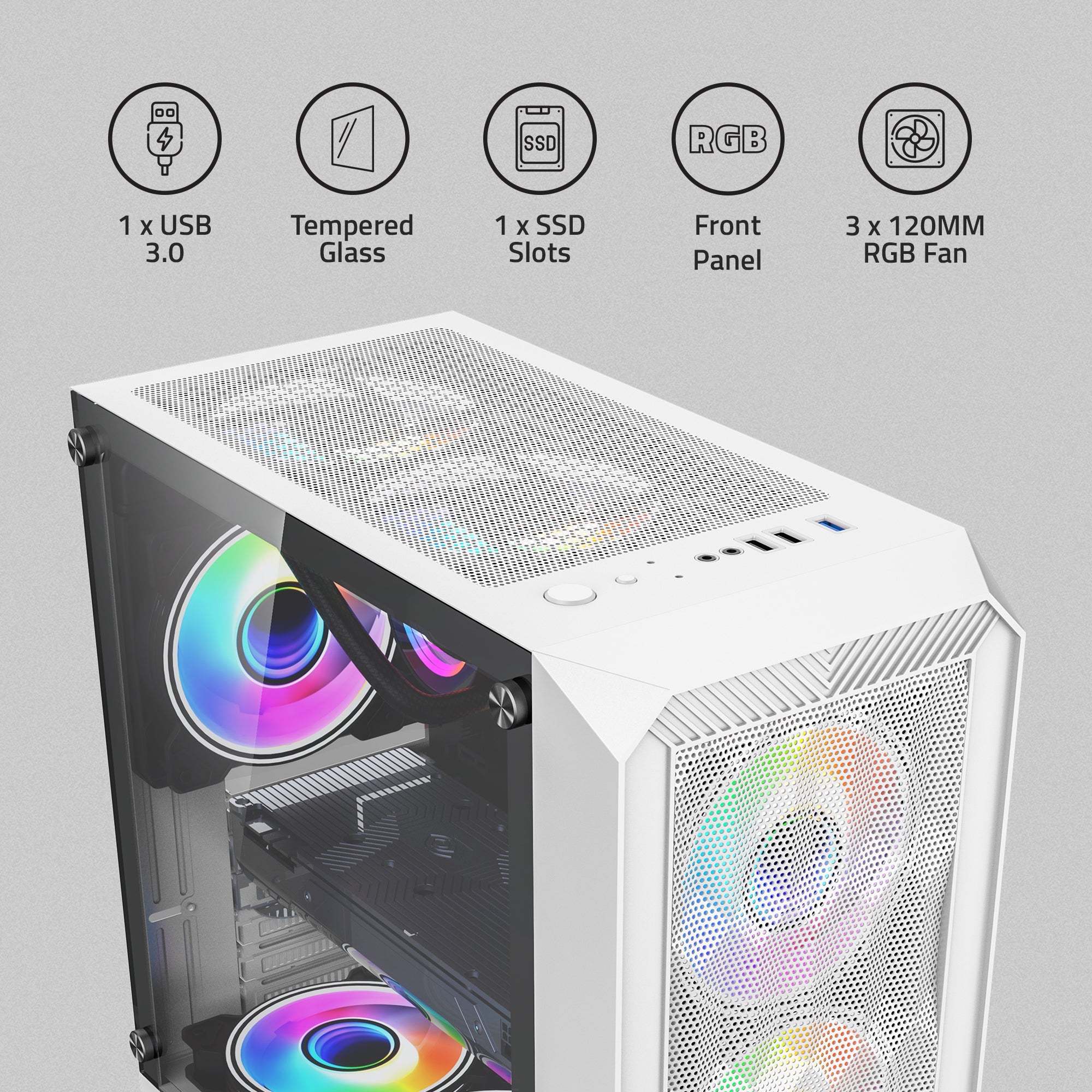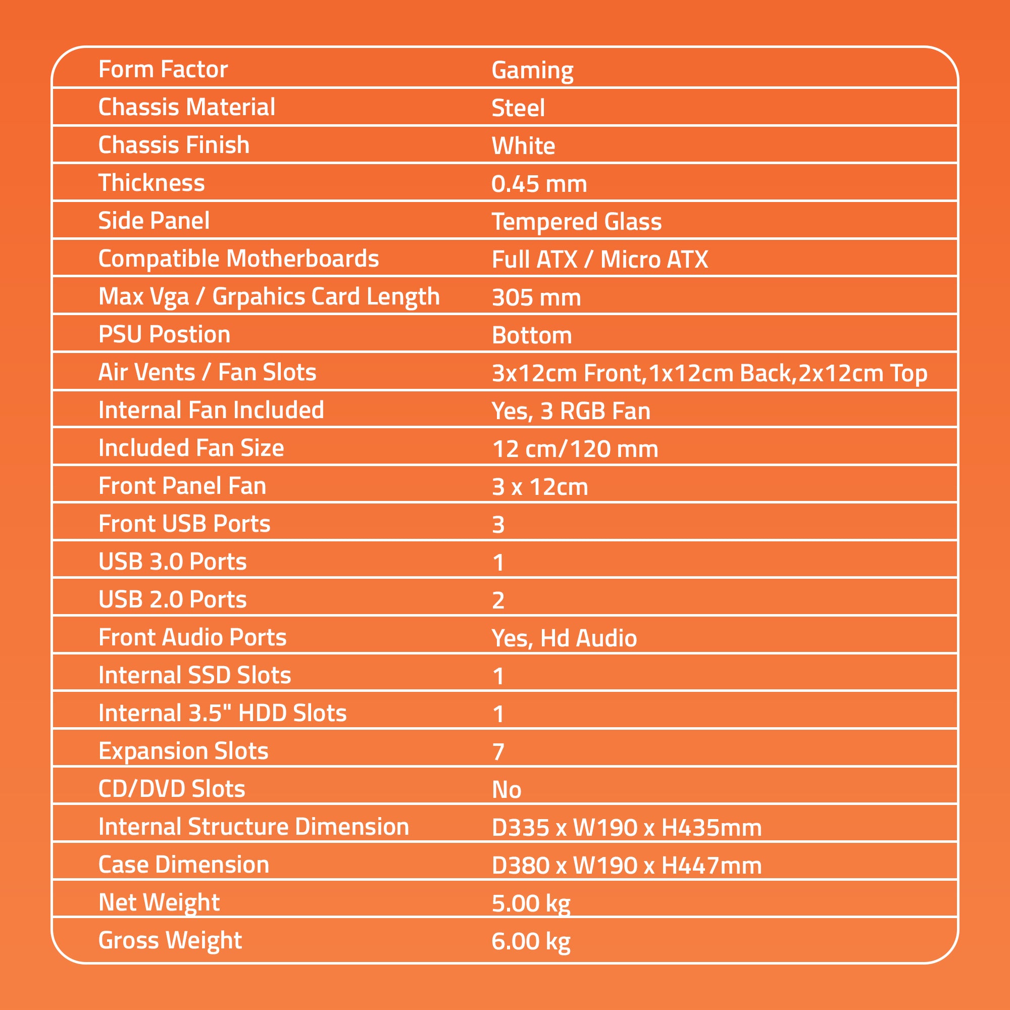 G8322W Computer Gaming Cabinet support Full ATX, Micro ATX Motherboard, 3 x RGB Fan with Sturdy built Quality. PSU Placement: Bottom ,USB 3.0: 1 USB 2.0: 2 . HD Audio: Yes Side Panel: Yes, Tempered Glass , SSD Slots: 1 , HDD Slots: 1 , Front Panel Fan: 3 x 12 cm Fan ,Top Panel Fan: 2x12 cm & Back Panel Fan : 1x 12 cm .Fan Size: 120mm/12 cm . Max. VGA/Graphics Card Length: 305 mm
