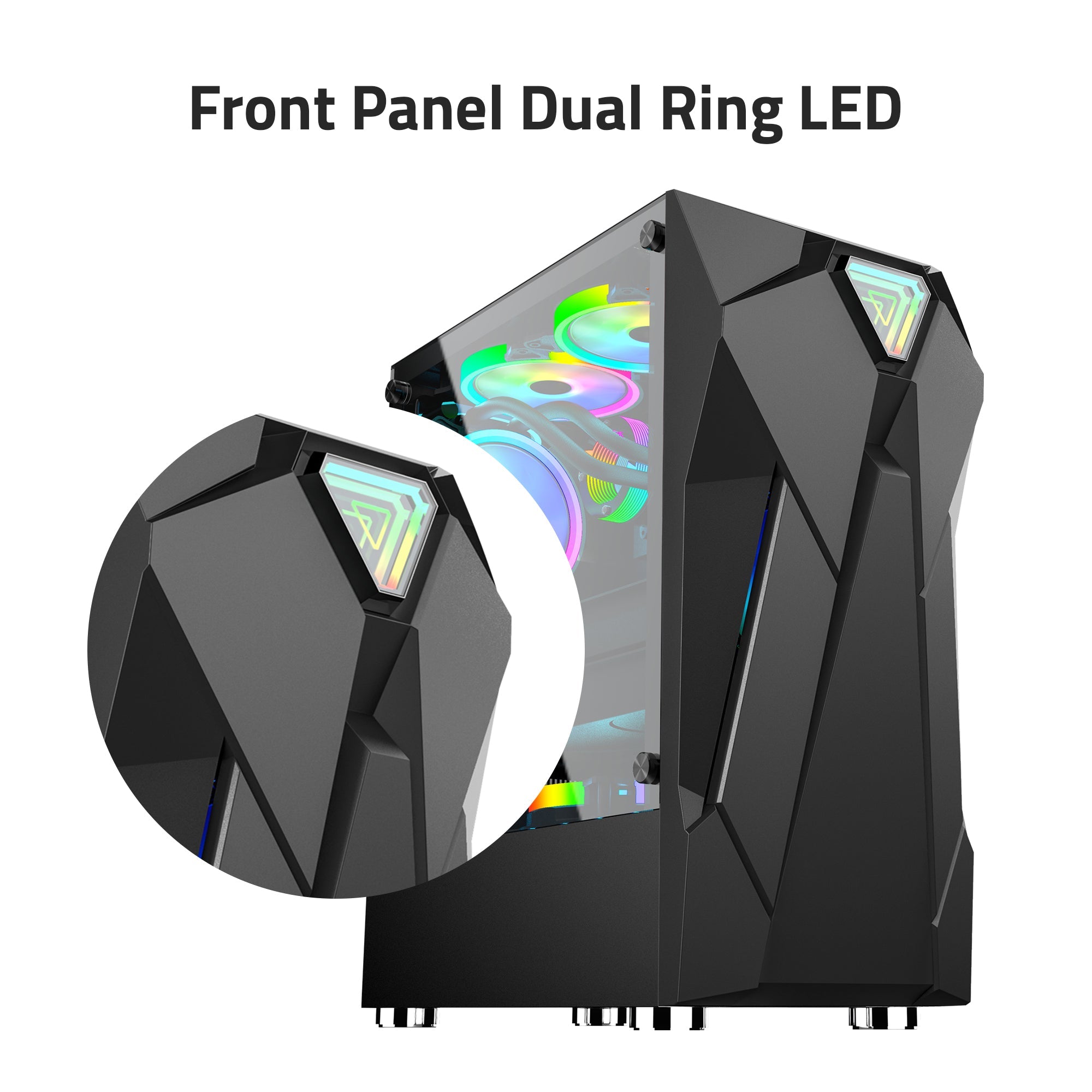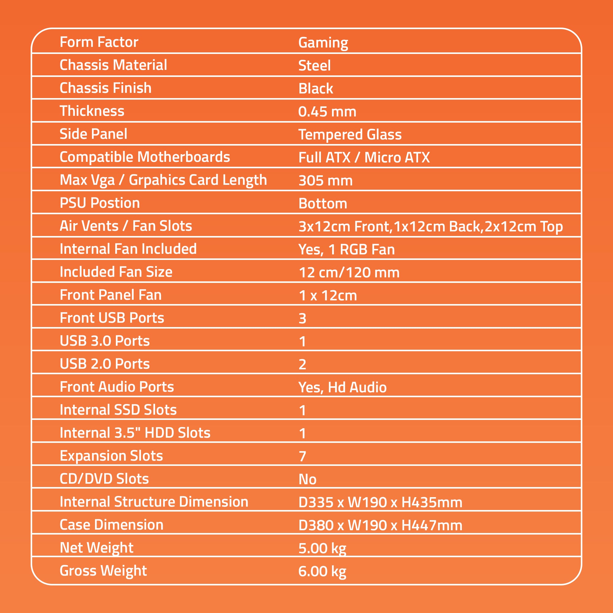 G8325 Computer Gaming Cabinet support Full ATX, Micro ATX Motherboard, 1 x RGB Fan with Sturdy built Quality. PSU Placement: Bottom ,USB 3.0: 1 USB 2.0: 2 . HD Audio: Yes Side Panel: Yes, Tempered Glass , SSD Slots: 1 , HDD Slots: 1 , Front Panel Fan: 3 x 12 cm Fan , Back Panel Fan: 1 x 12 cm , Top Panel Fan: 2 x 12 cm .Fan Size: 120mm/12 cm . Max. VGA/Graphics Card Length: 305 mm