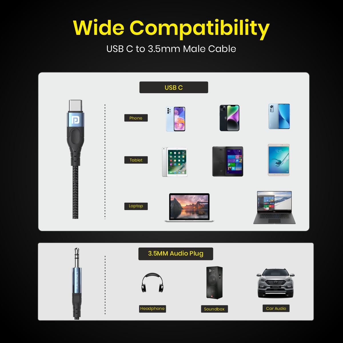 - Plug and play: Portronics Type C to AUX Cable can easily connect your Type C devices to car stereo, speakers, headphones or any device with 3.5mm audio jack or Aux-in port. No drivers or apps required, just easily plug and play. Let the music never stop.