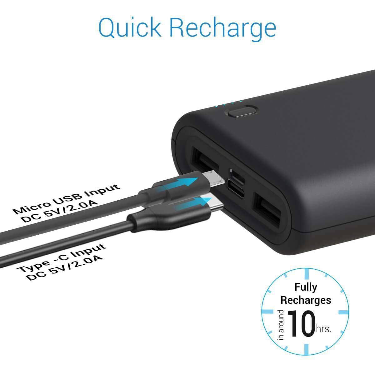 This Battery Charger has dual input options Micro USB and Type C ports. One Input with 2A Type-C and other with fast charging 2A Micro USB port.