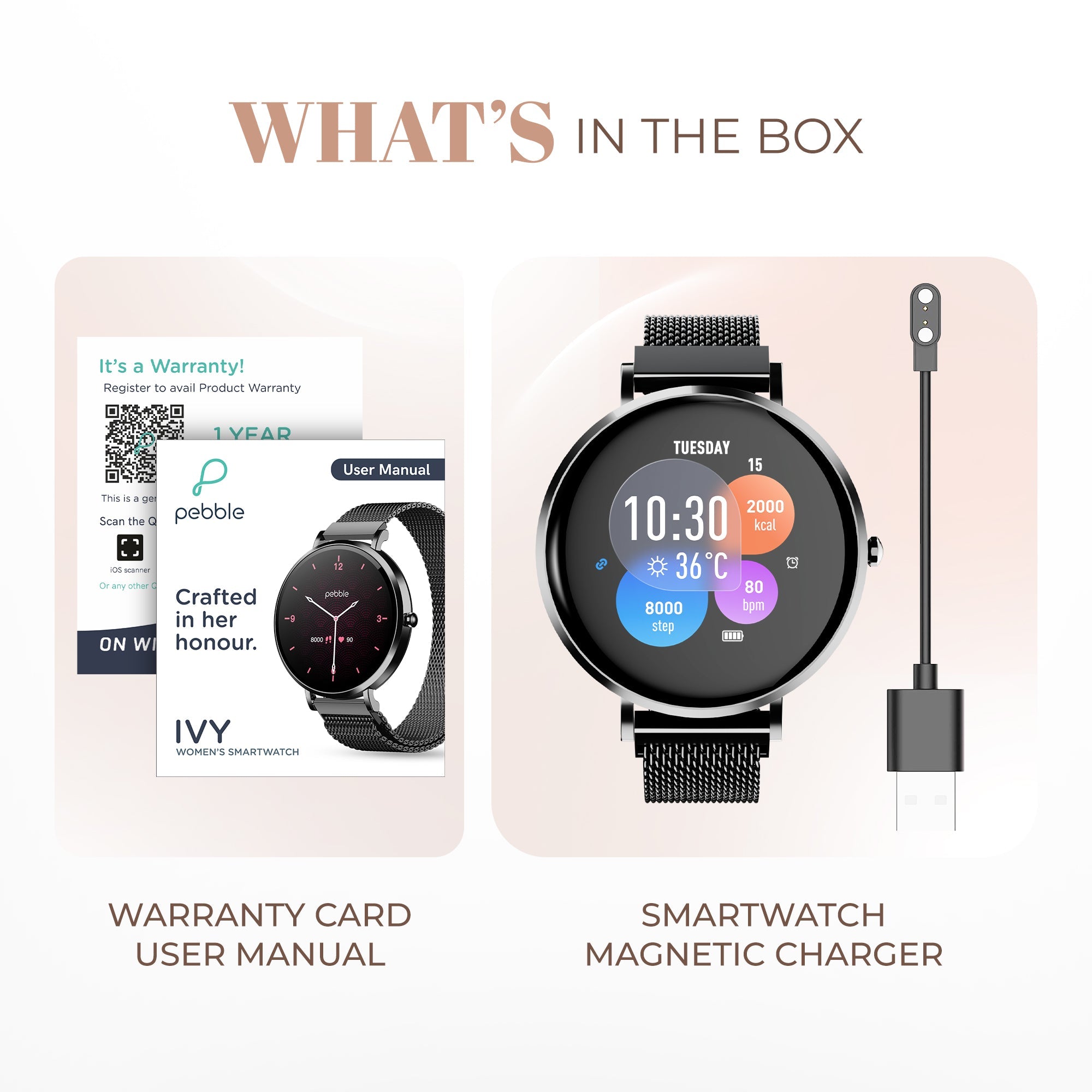 Style Meets Smartness with Pebble Ivy The Pebble Ivy Smartwatch is crafted for modern women who value elegance and utility. Featuring a 1.27” HD display and premium metallic mesh strap, it blends fashion with function. From Bluetooth calling and female health tracking to in-built games, DIY watch faces, and voice assistant, Pebble Ivy keeps you connected, informed, and in style every day, all day.