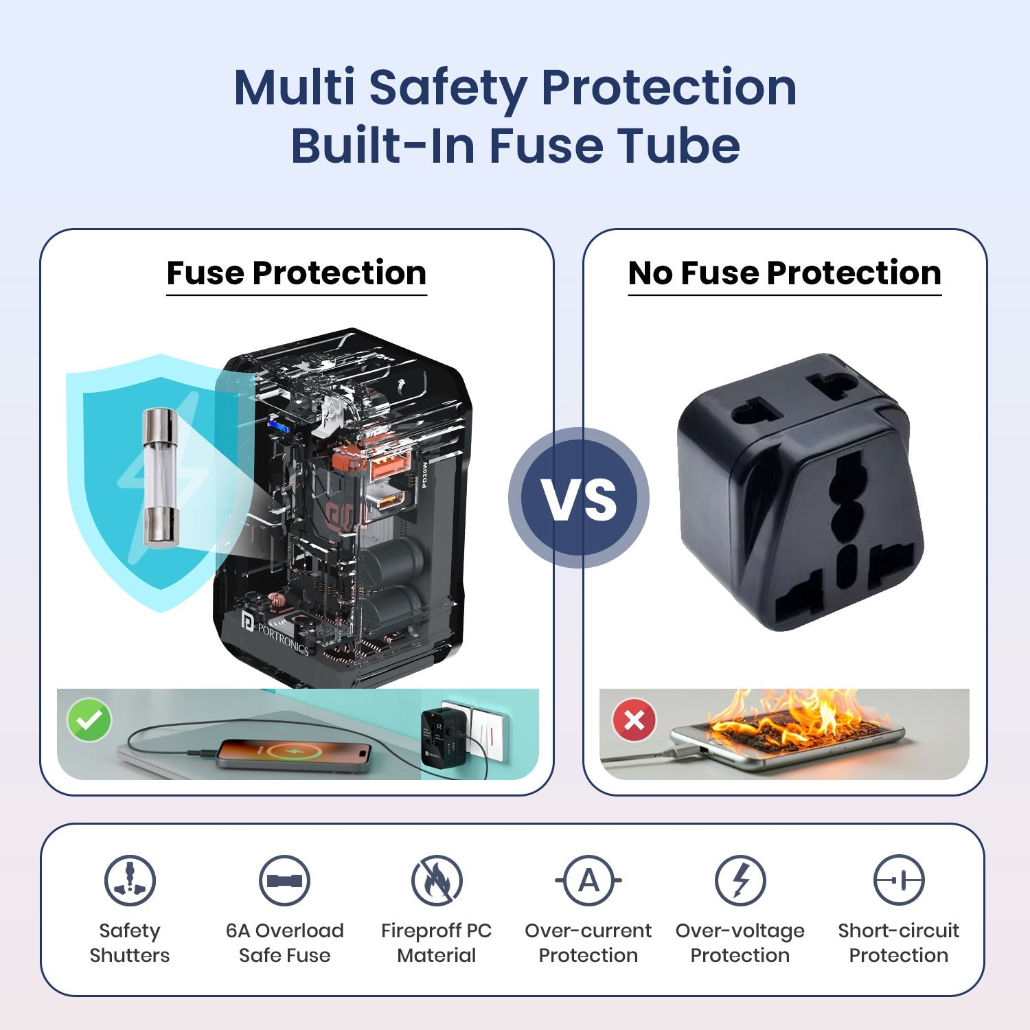 • Fuse Protection for Safety : The built-in fuse protects your devices from power surges and electrical issues, providing peace of mind while charging electronics safely, no matter where you are in the world.
