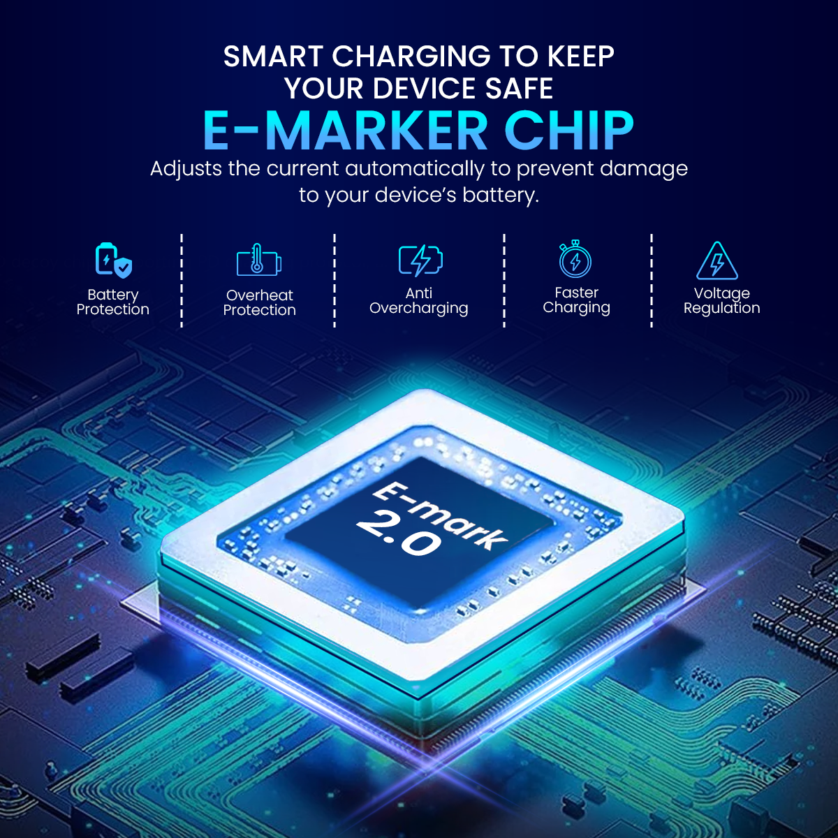 - Smart Charging with E-mark Chip: The cable is equipped with an E-marker smart chip, which ensures device safety along with fast charging. It intelligently matches the required current to prevent damage to the device’s battery.