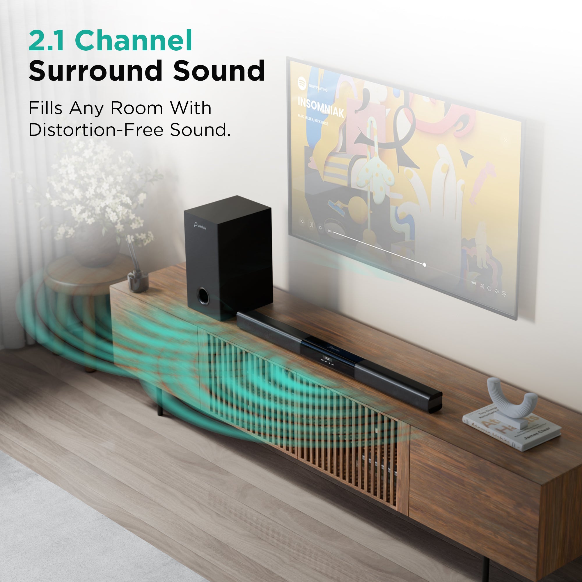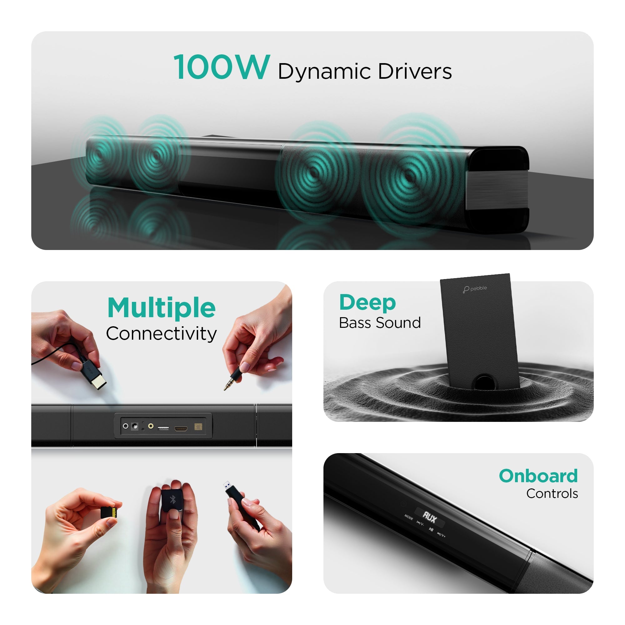 Elevate your home audio with the Pebble Magna 10 Sound Bar Featuring 100W Dynamic Drivers and Deep Bass Sound| this 21 Channel soundbar| complete with a dedicated Subwoofer| delivers powerful and immersive audio that brings your movies| music| and games to life Control your listening experience effortlessly with the Digital Display and included Remote Controller The Digital Audio Power Amplifier and Bass & Treble Equalizer allow for precise sound customization With multiple connectivity options including Aux| HDMI| USB| TF| and Bluetooth| you can easily connect all your devices Experience Realistic Sound and Low Latency for a truly engaging audio performance