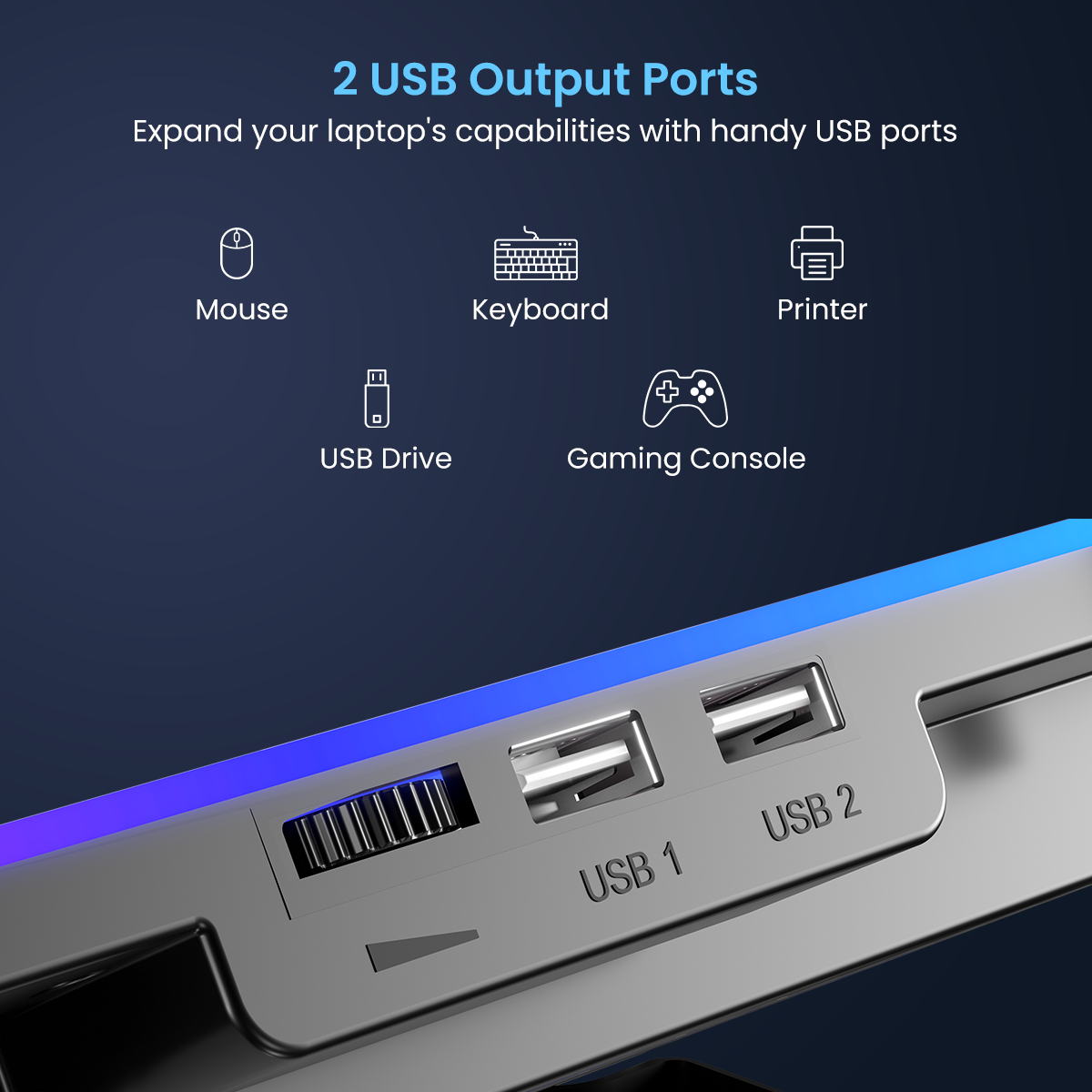 - Dual USB 2.0 Ports: Comes with 2 USB 2.0 ports, one can be used to operate the cooling fans, and the other one can be used to connect devices such as a keyboard, mouse, flash drive, etc. to the laptop.