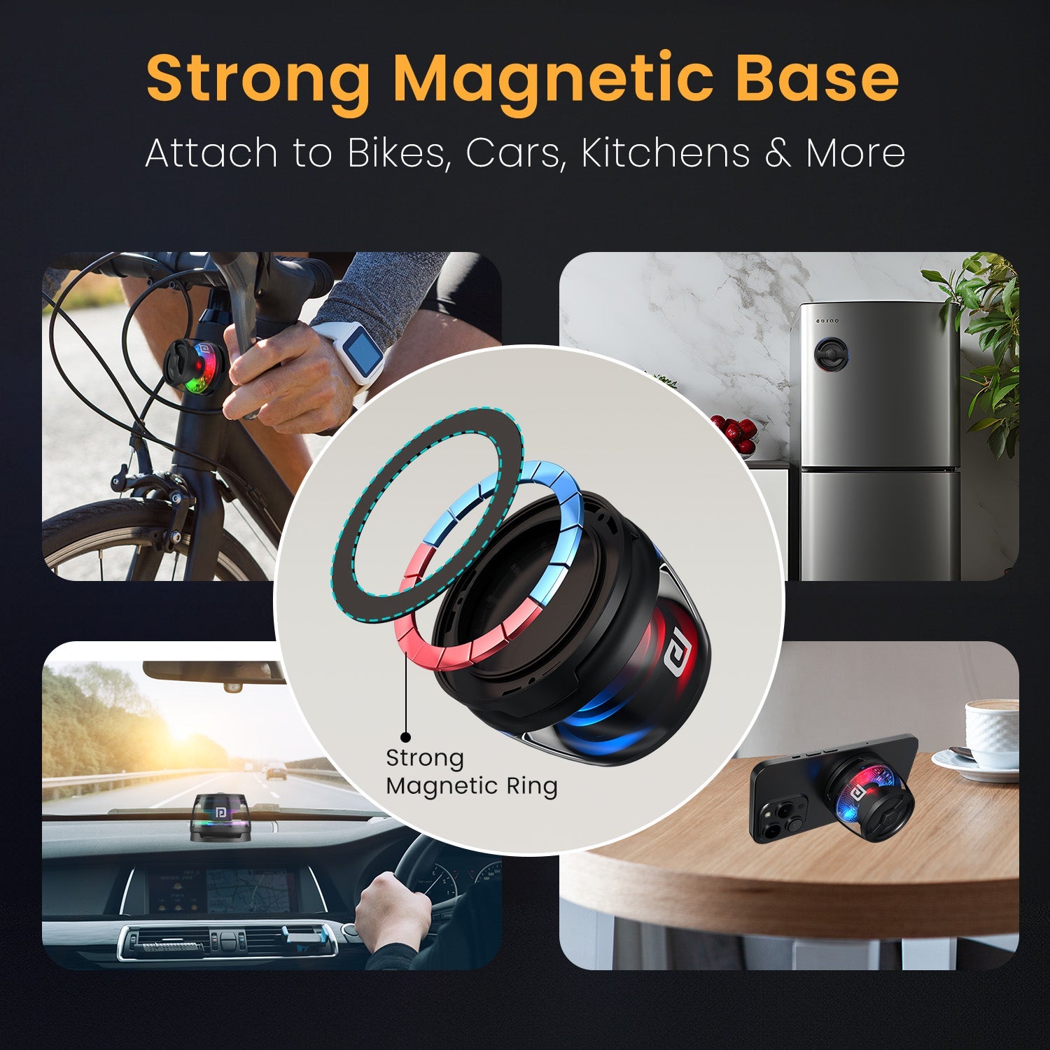 Magnetic Speaker Design – Easily attach your speaker to metal surfaces with its strong magnetic base, ideal for car dashboards, kitchen areas, or workspaces.