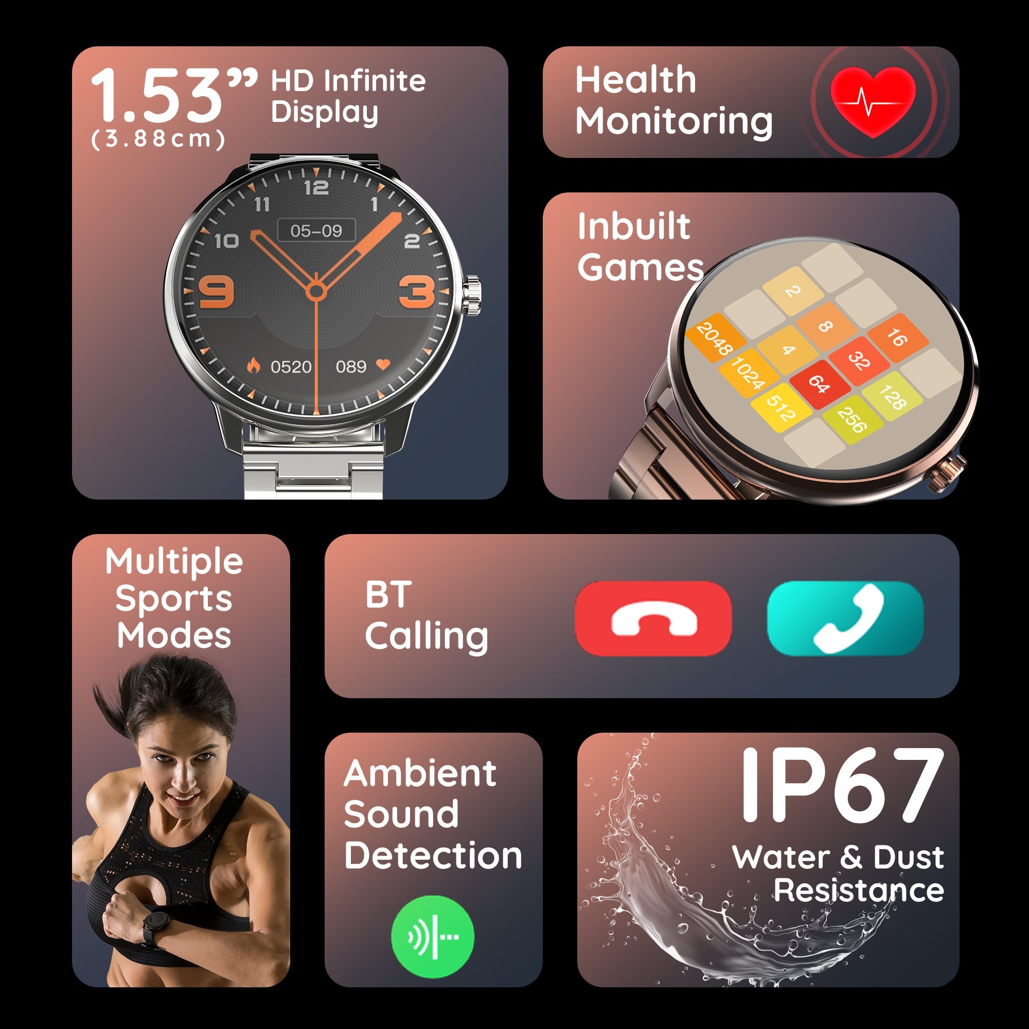 Introducing the Pebble Smartwatch with a captivating 1.53" (3.88 cm) HD Infinite Display, offering a stunning visual experience. Seamlessly stay connected with Bluetooth Calling, monitor your heart rate and blood oxygen levels, and achieve tranquillity with Zen Mode and ambient sound detection. Tailor your fitness journey with Multi Sports Modes, and enjoy entertainment on the go with inbuilt games. Enhance your productivity with Voice Assistant, Alarm & Notification system, Smart Calculator, and Smart Calendar. Experience the epitome of style and functionality with the Pebble Smartwatch.