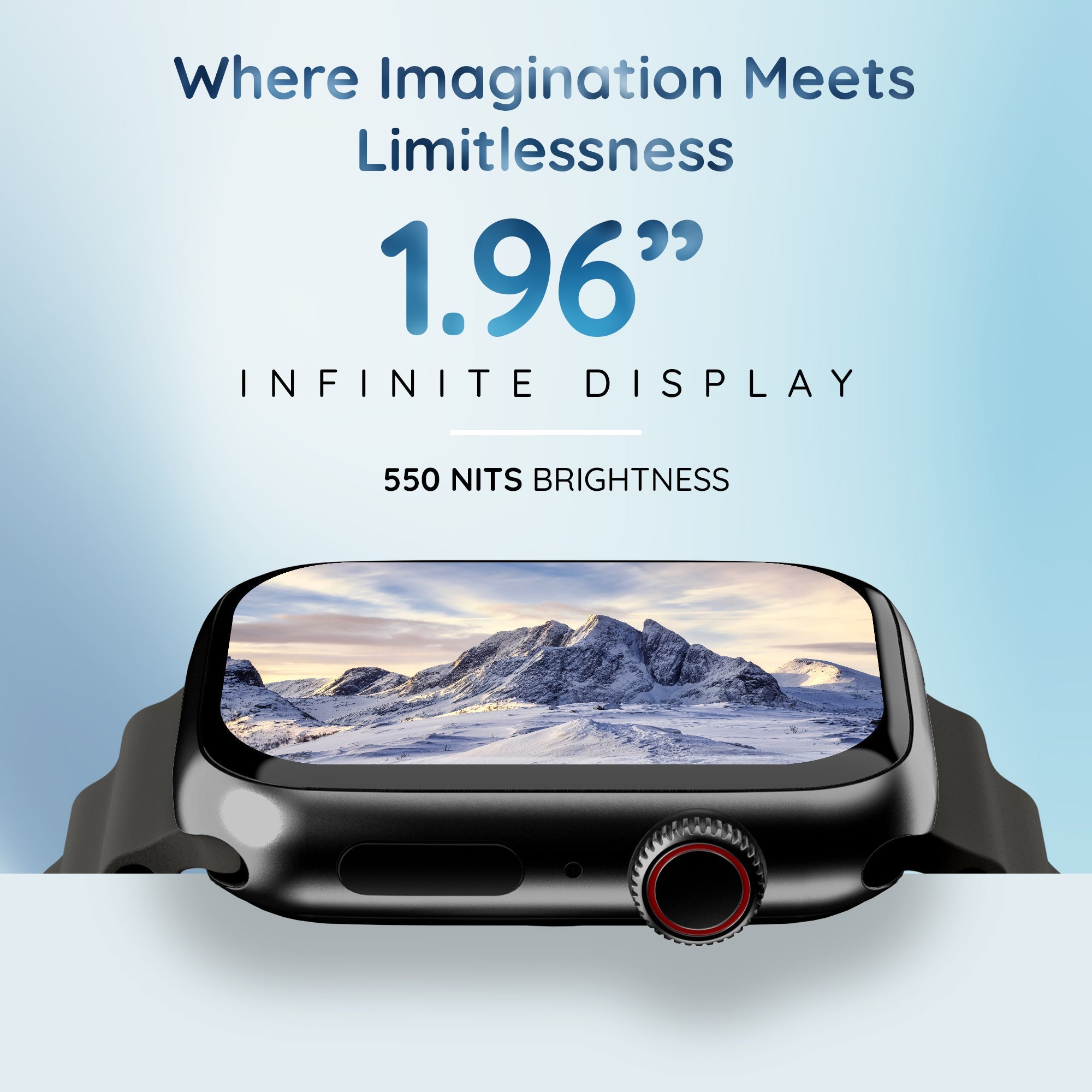 Infinite Display: 1.96" Infinite display | Experience brilliance on your wrist with an almost bezel-less full touch curved screen
