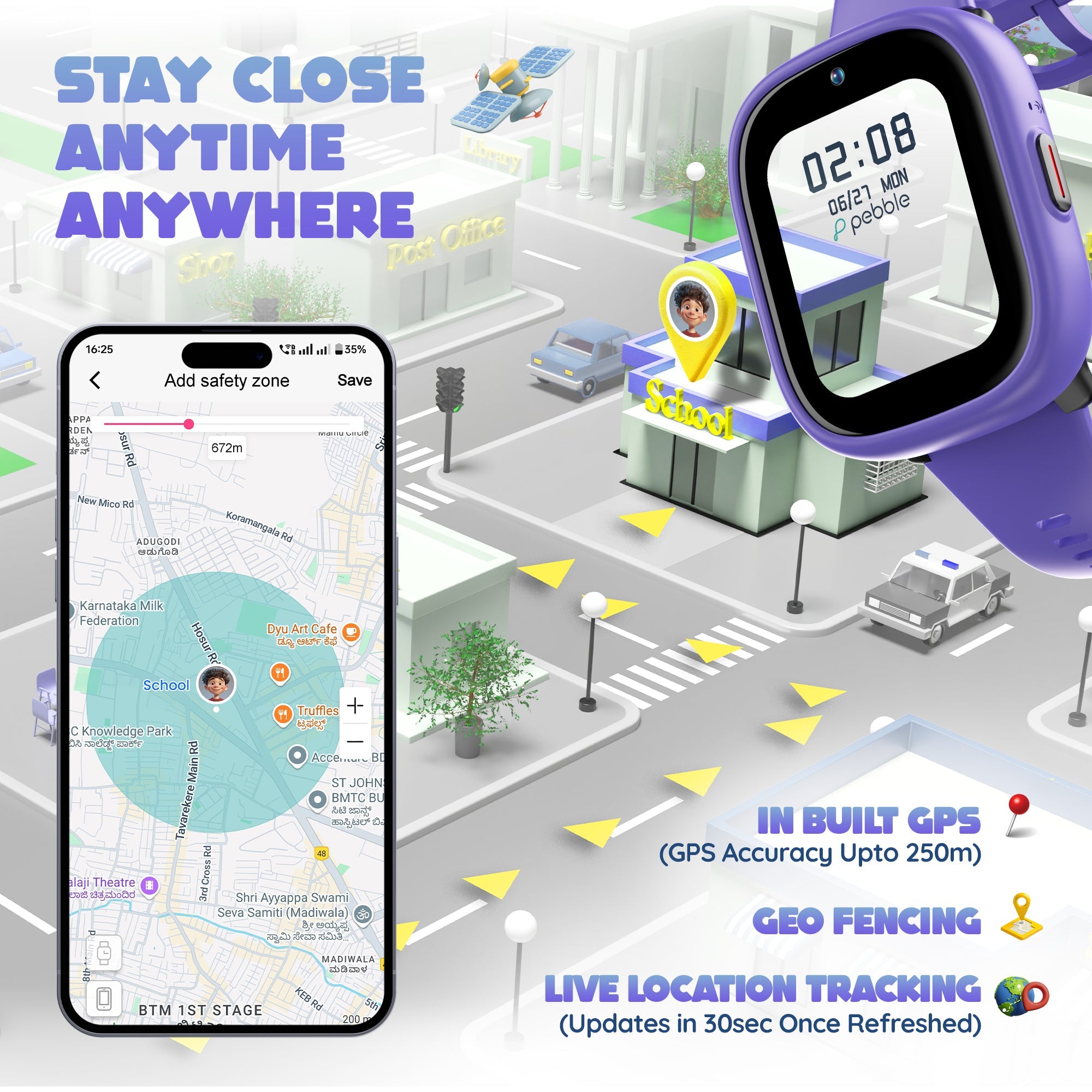 InBuilt GPS: Accurate location tracking (up to 250 meters) ensures you know where your child is at all times.
