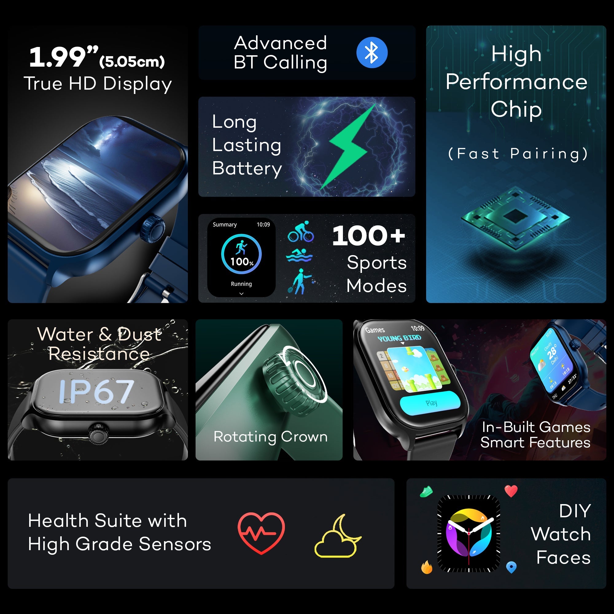 The Pebble NEO is a feature-rich smartwatch with a 1.99" True HD display, Bluetooth calling, SpO2 and heart rate monitoring. It includes a rotating crown, multiple sports modes, sleep tracking, and various watch faces, including DIY options. Lightweight in design, it also offers alarms, notifications, and built-in games, making it a versatile companion for your everyday needs.
