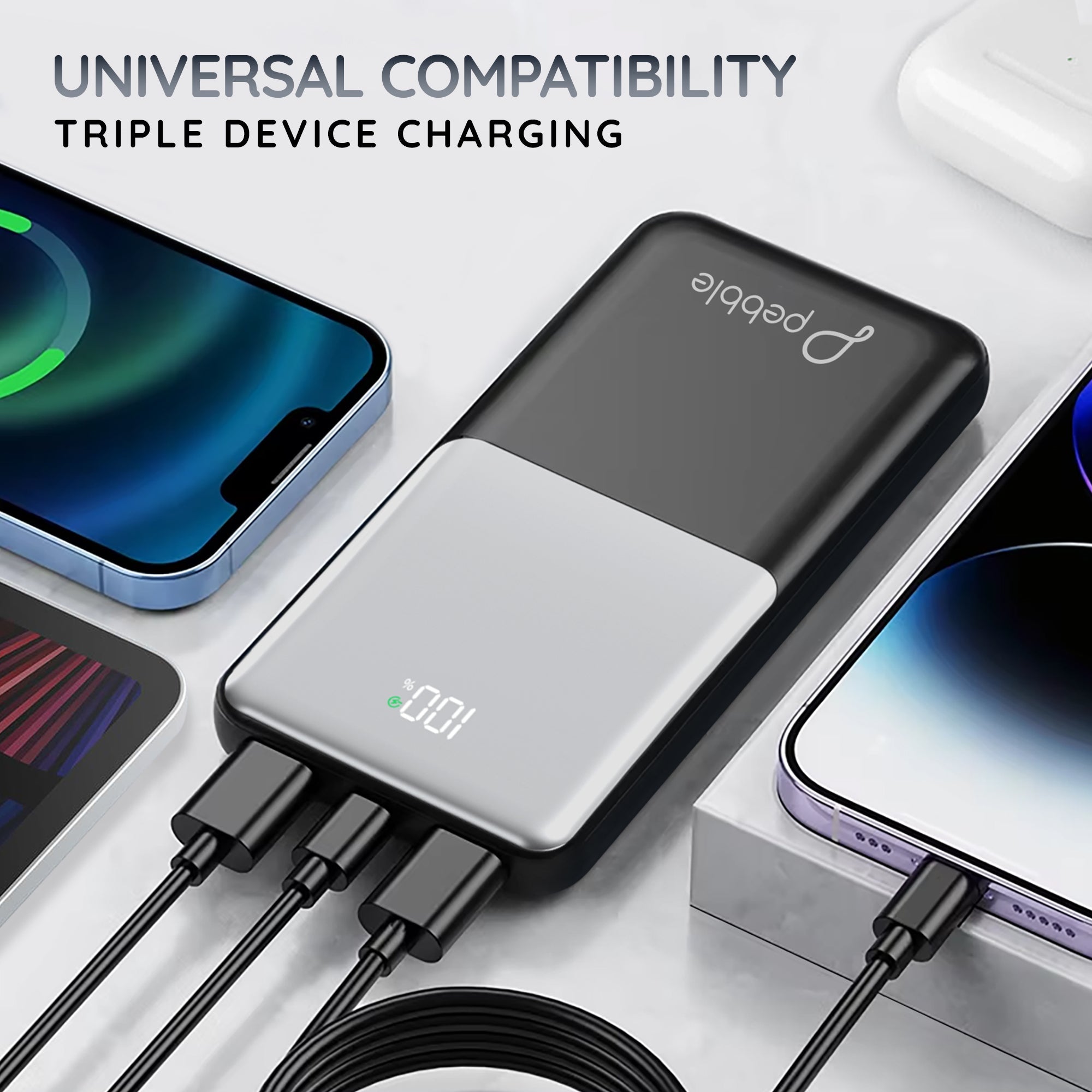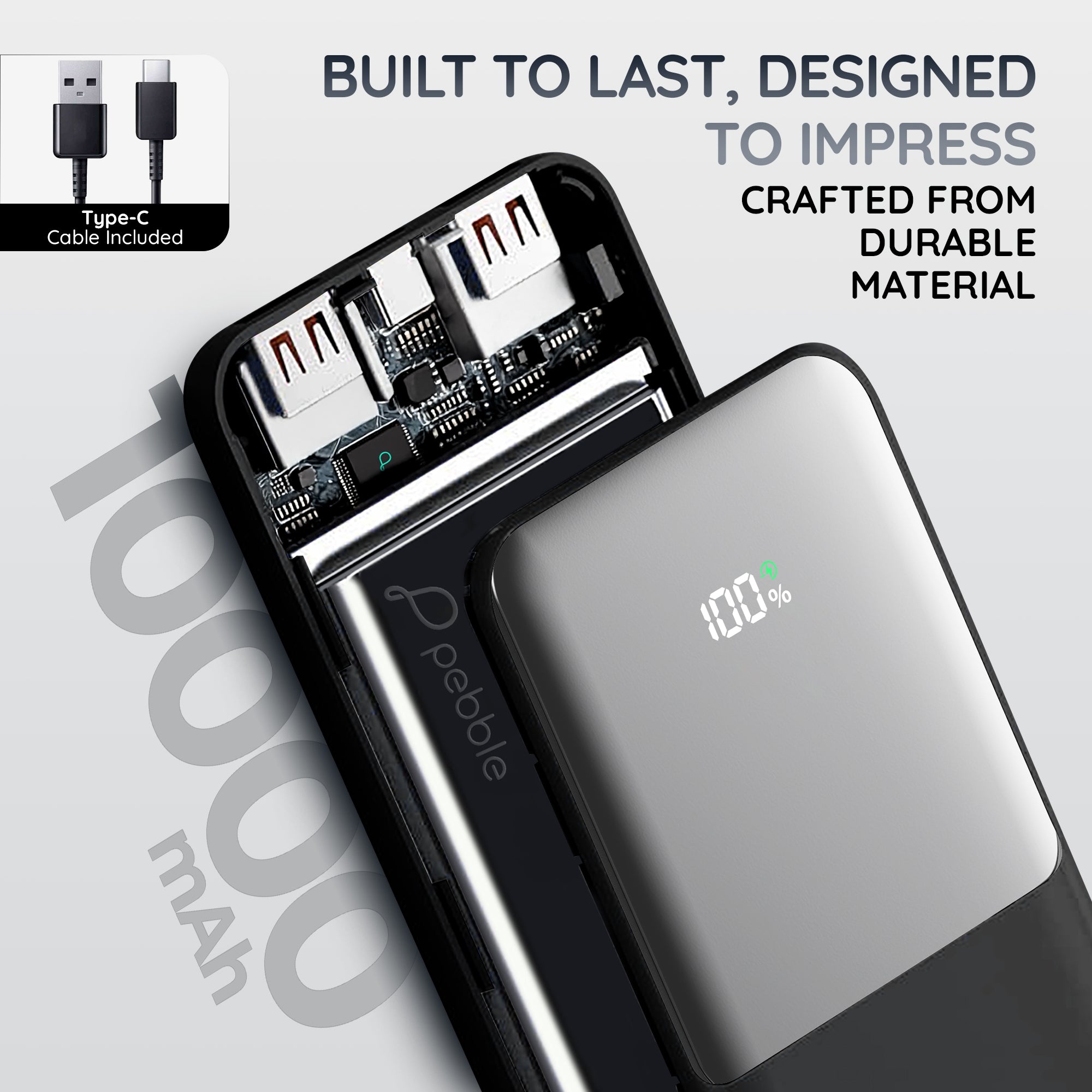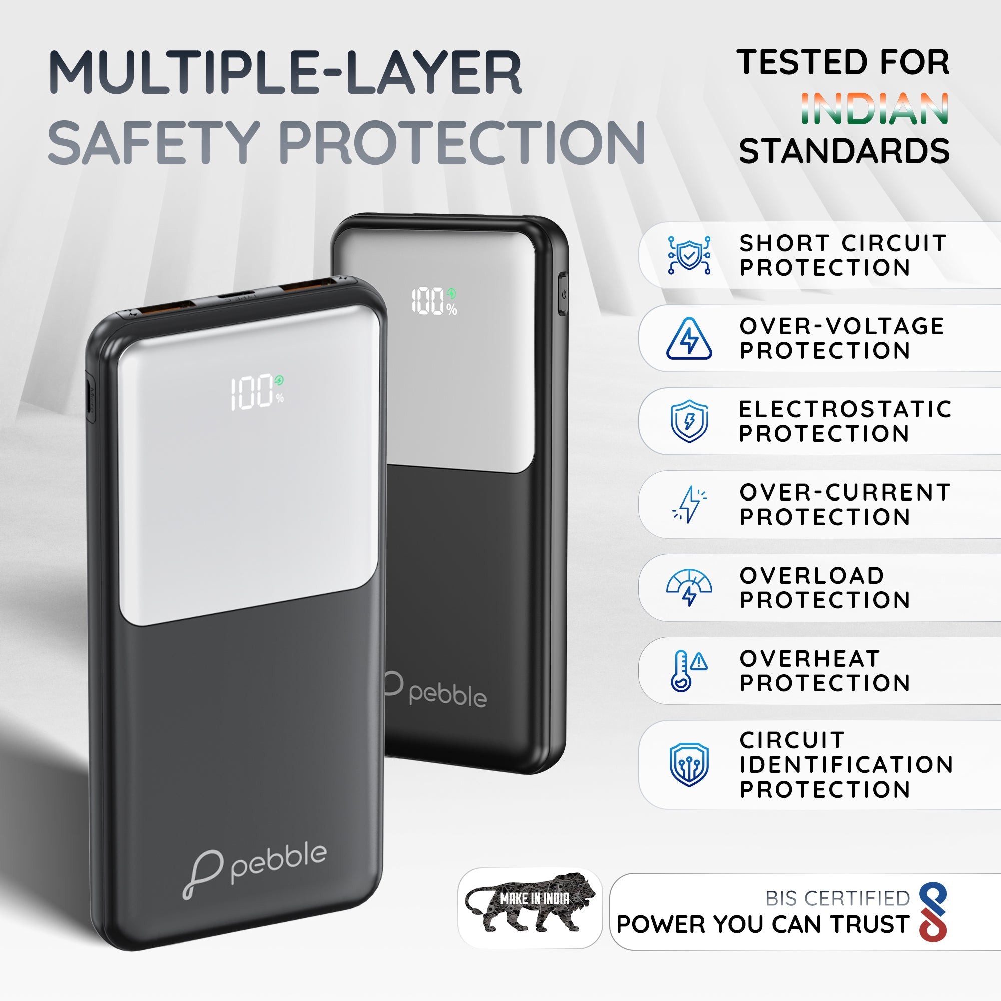 Stay powered on the go with Pebble Rapid Alpha, a 10,000mAh power bank, featuring 22.5W ultra-fast charging and the ability to charge up to three devices at once via QC 3.0 Dual USB and PD 3.0 Type C ports. Its slim, lightweight design is perfect for travel, work, and everyday use. An intelligent display shows battery percentage, while multi-layer safety protection and BIS certification ensure secure charging.