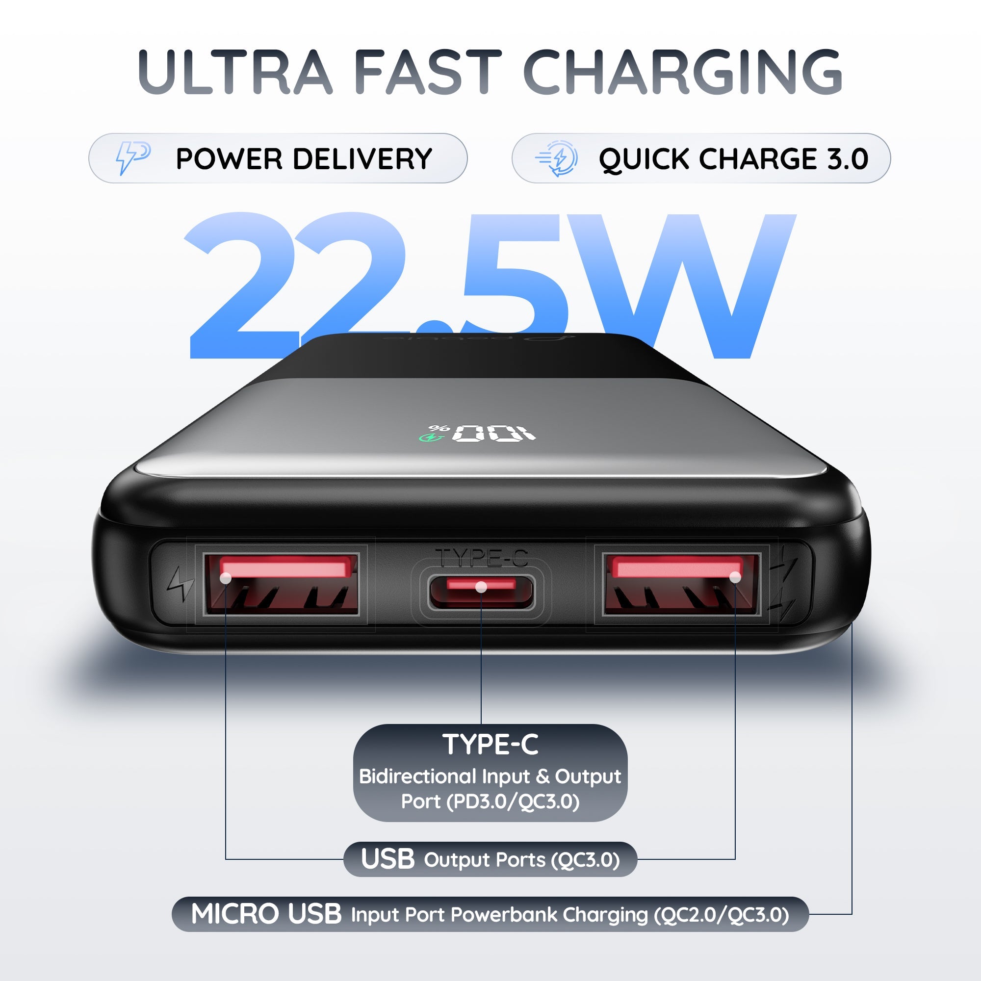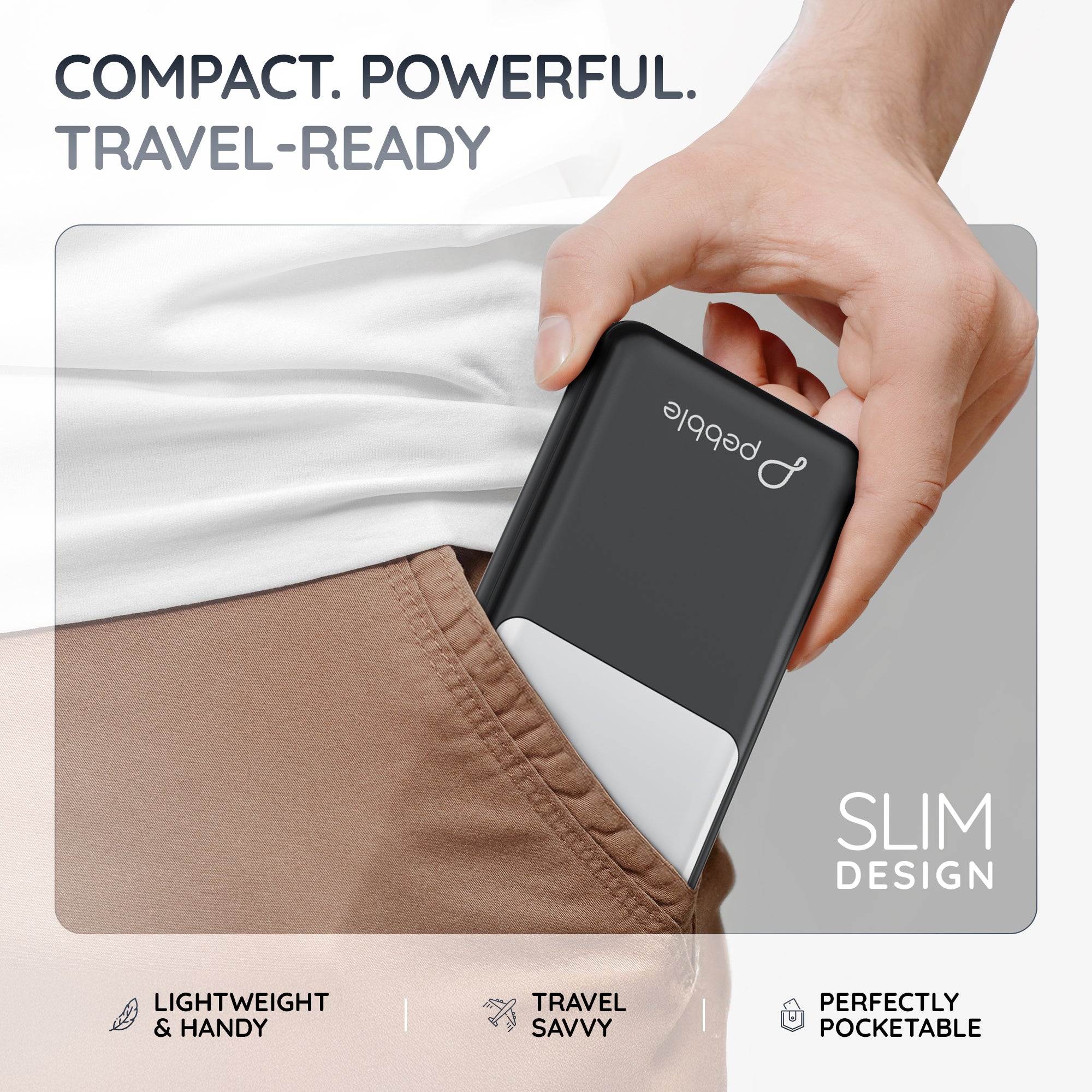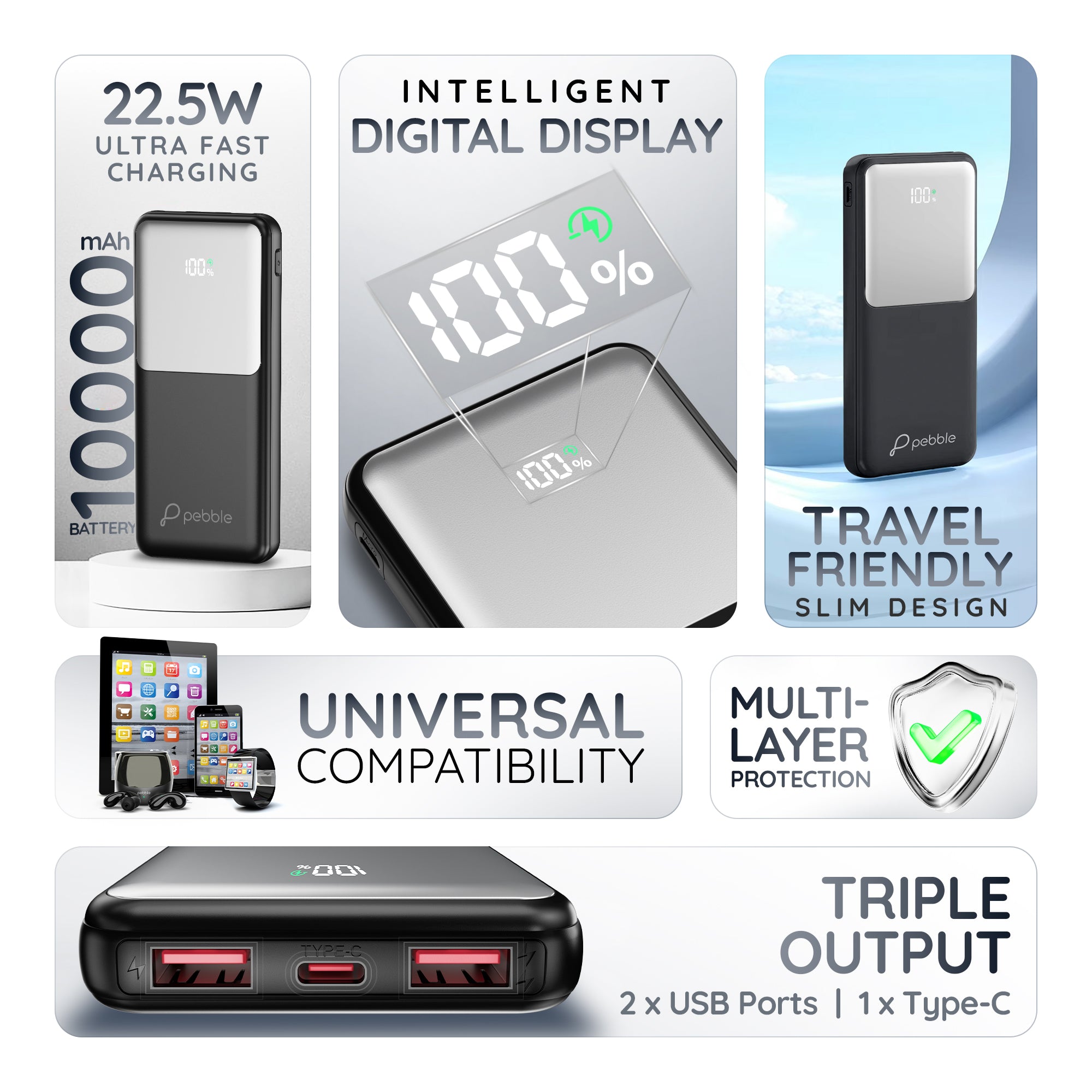 Stay powered on the go with Pebble Rapid Alpha, a 10,000mAh power bank, featuring 22.5W ultra-fast charging and the ability to charge up to three devices at once via QC 3.0 Dual USB and PD 3.0 Type C ports. Its slim, lightweight design is perfect for travel, work, and everyday use. An intelligent display shows battery percentage, while multi-layer safety protection and BIS certification ensure secure charging.