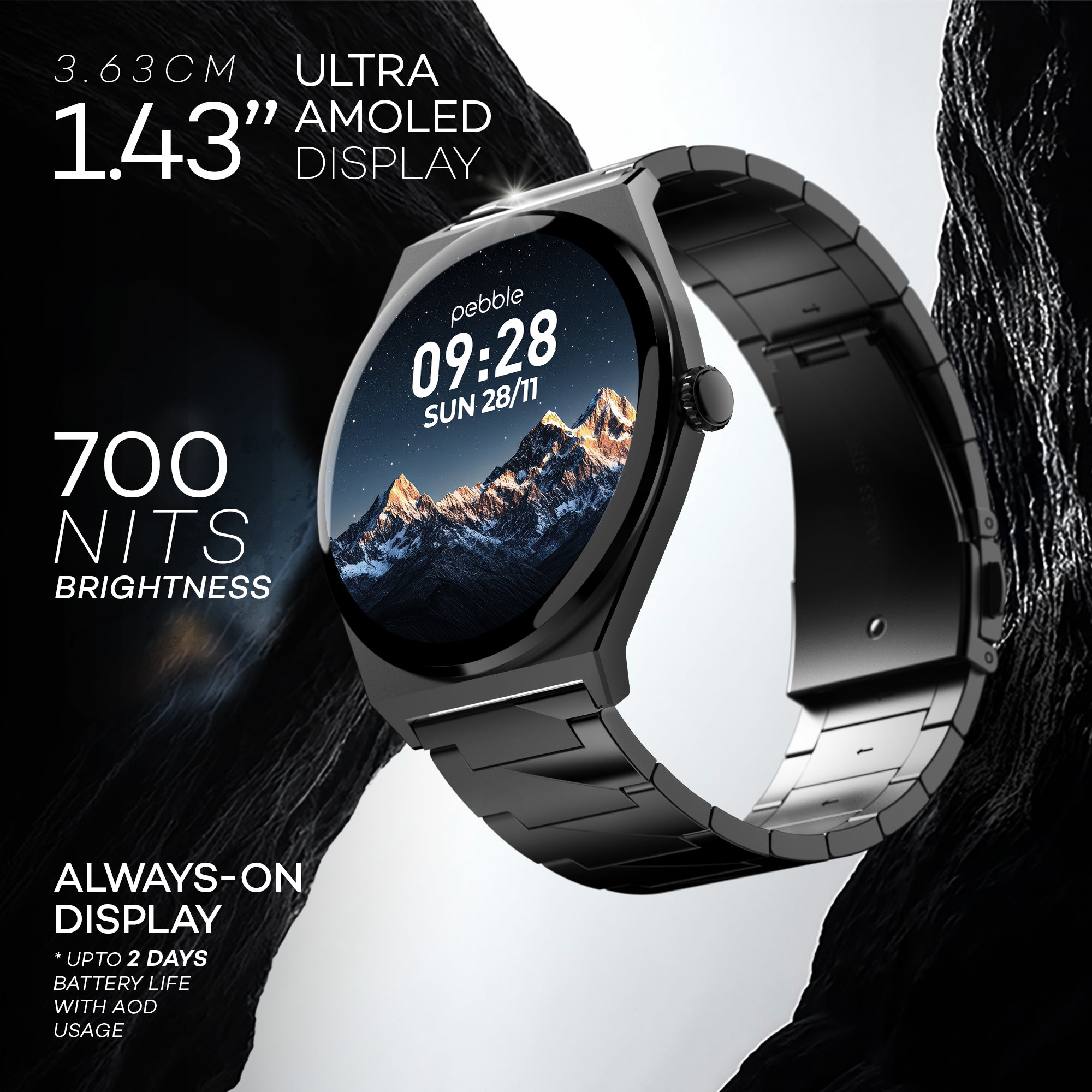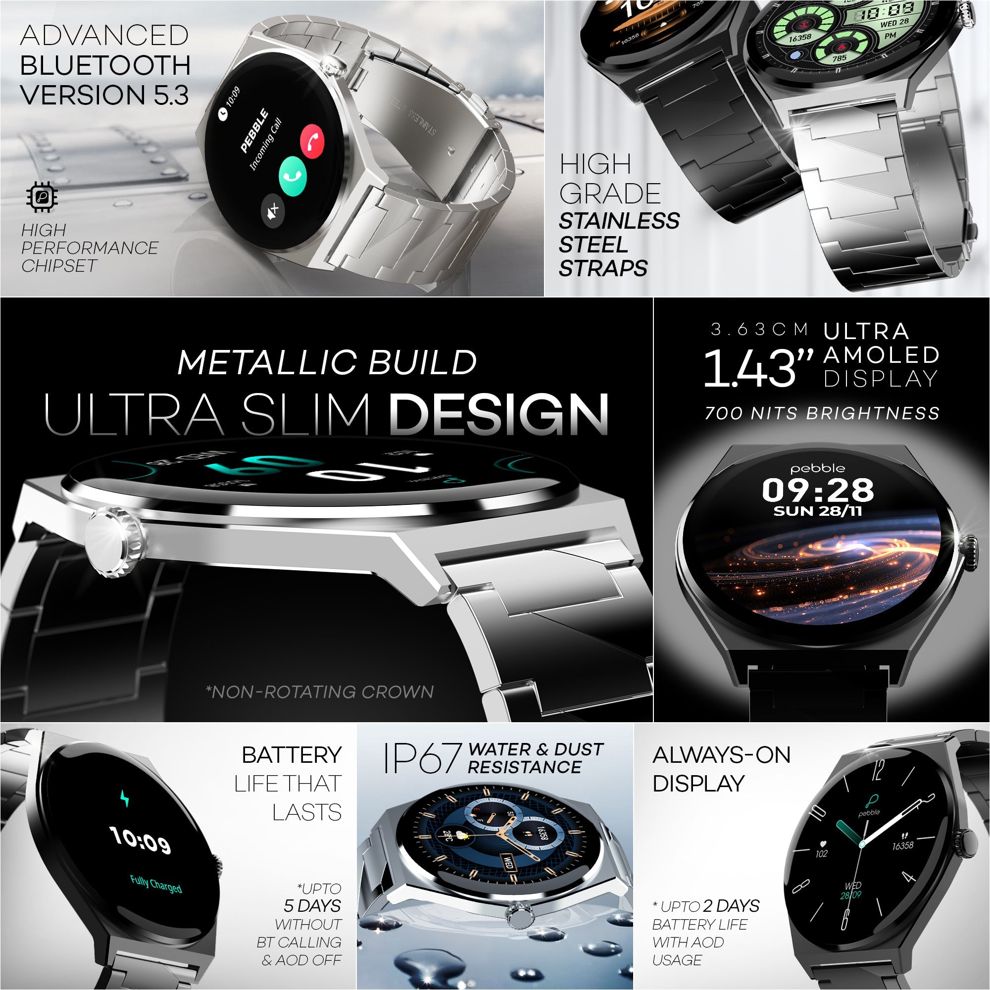 Elevate your style with the Pebble Royale Steel smartwatch, boasting a stunning 1.43" Ultra AMOLED display with 700 Nits brightness. Its slim 6.5mm dial design is crafted from high-grade stainless steel, ensuring durability and sophistication. Stay connected with BT calling, customize your look with DIY watch faces, and track your fitness goals with multiple sports modes. Plus, enjoy an always-on display (AOD) and smart features that keep you informed and in control.