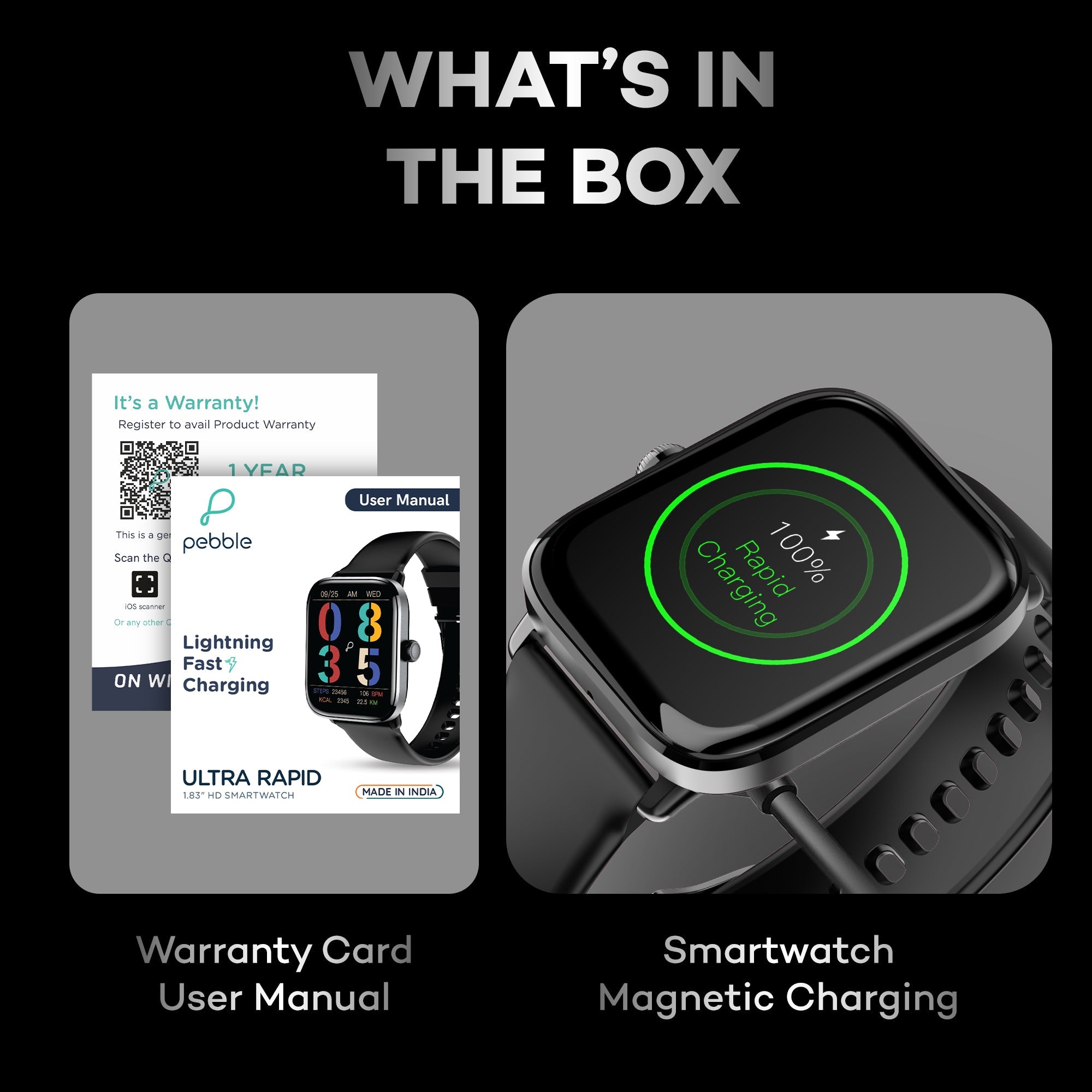 Experience cutting-edge technology with the Pebble Ultra Rapid Smartwatch, featuring a vibrant 1.83" HD display and India's first fastest charging capability. Designed with a premium metal build and a sleek unisex design, this smartwatch offers Bluetooth Calling with a one-time connection, AI Voice Assistant, and customizable watch faces. Track your daily activities, monitor your blood oxygen levels, heart rate, stress, sleep, and even female menstrual periods. Stay connected with call, SMS, and social media notifications, check the weather, and enjoy multiple sport modes for a comprehensive fitness experience.
