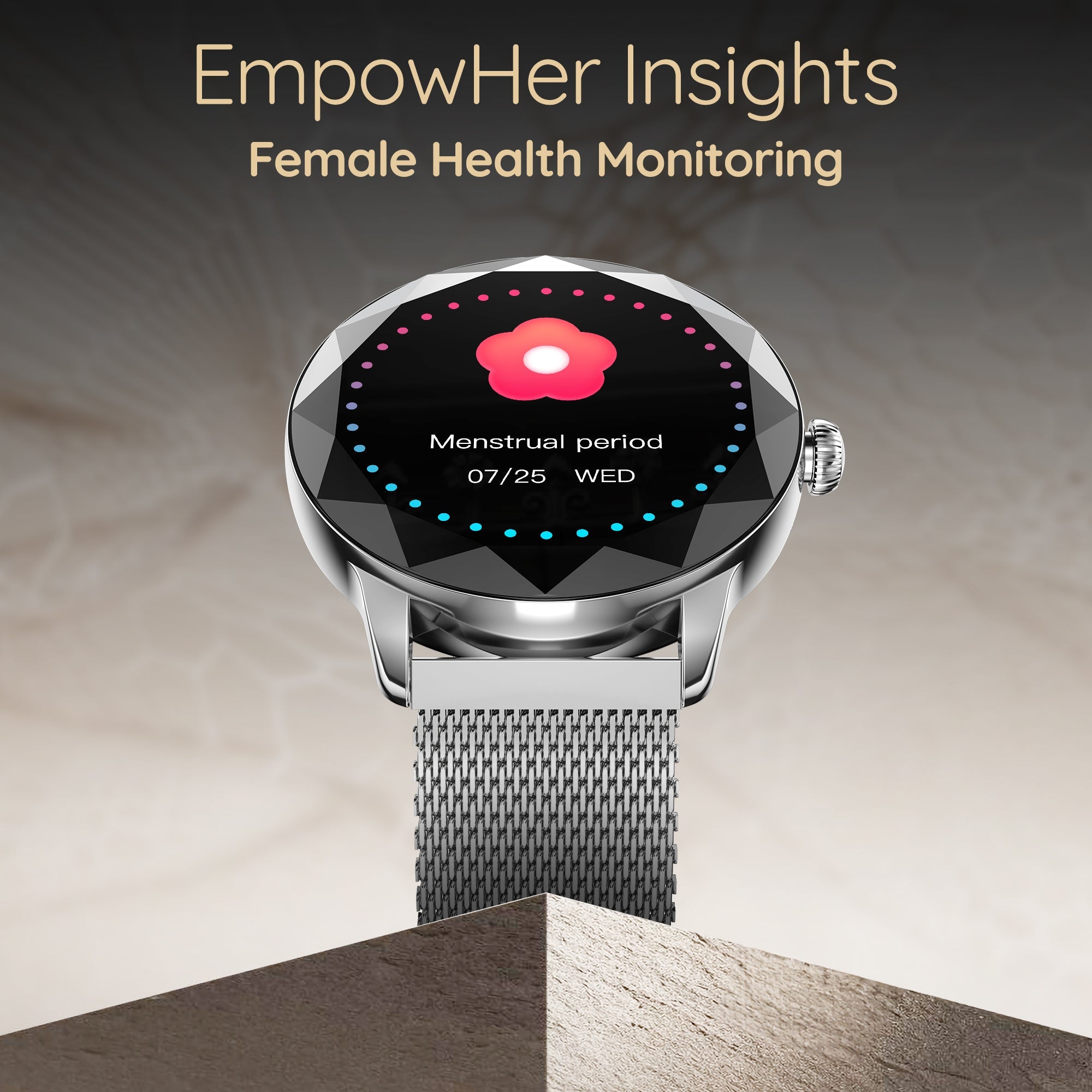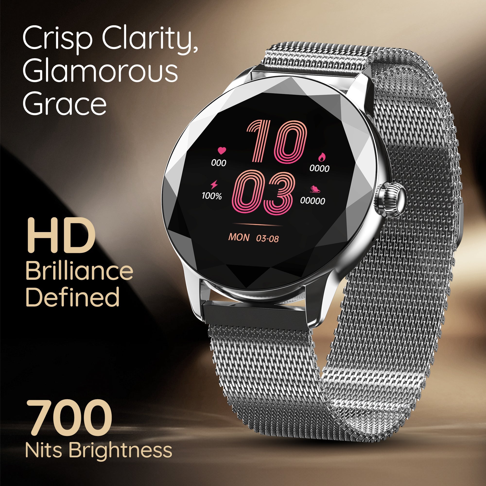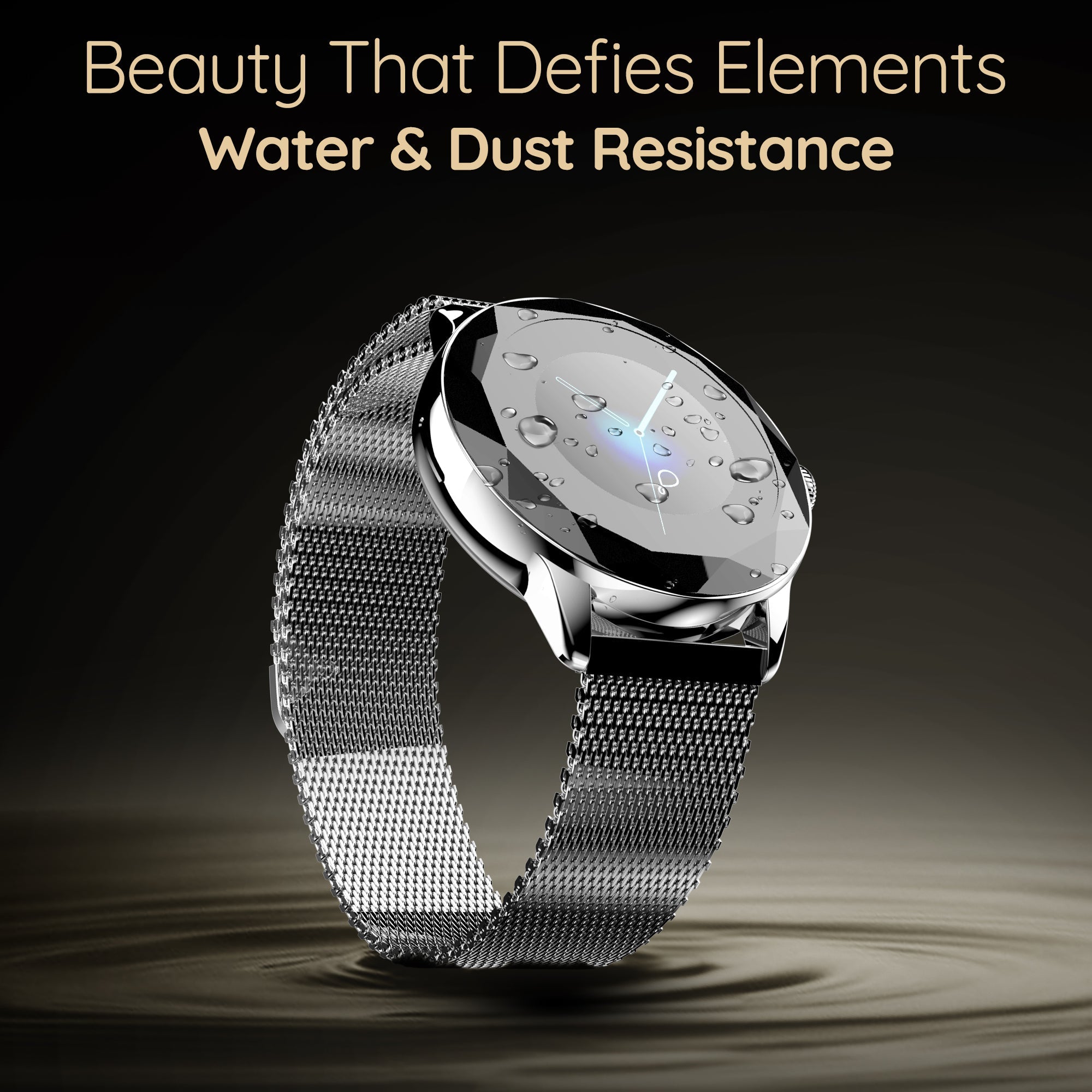 Pebble Vienna, featuring a sleek diamond-cut design and a vibrant 1.27" HD display. Stay connected with Bluetooth calling and enjoy dedicated female health monitoring alongside heart rate and sleep tracking. Engage in various sports modes and customize your watch face to suit your style. Benefit from AI voice assistance, stay organized with alarms and notifications, and plan your days efficiently with the smart calendar. Additionally, stay updated on the go with real-time weather information, ensuring you're always prepared for the day ahead.