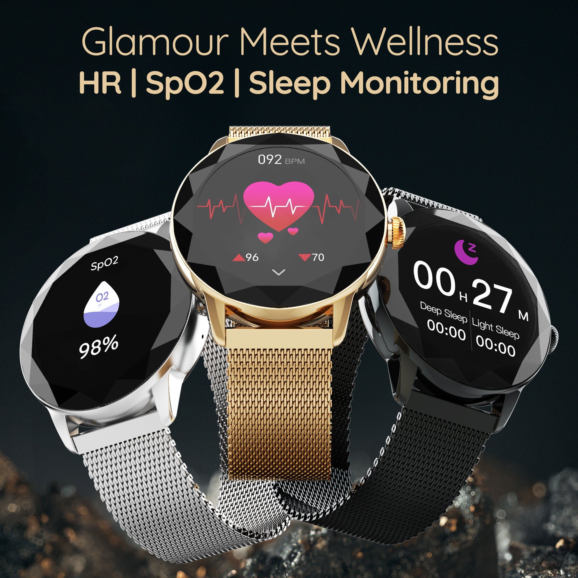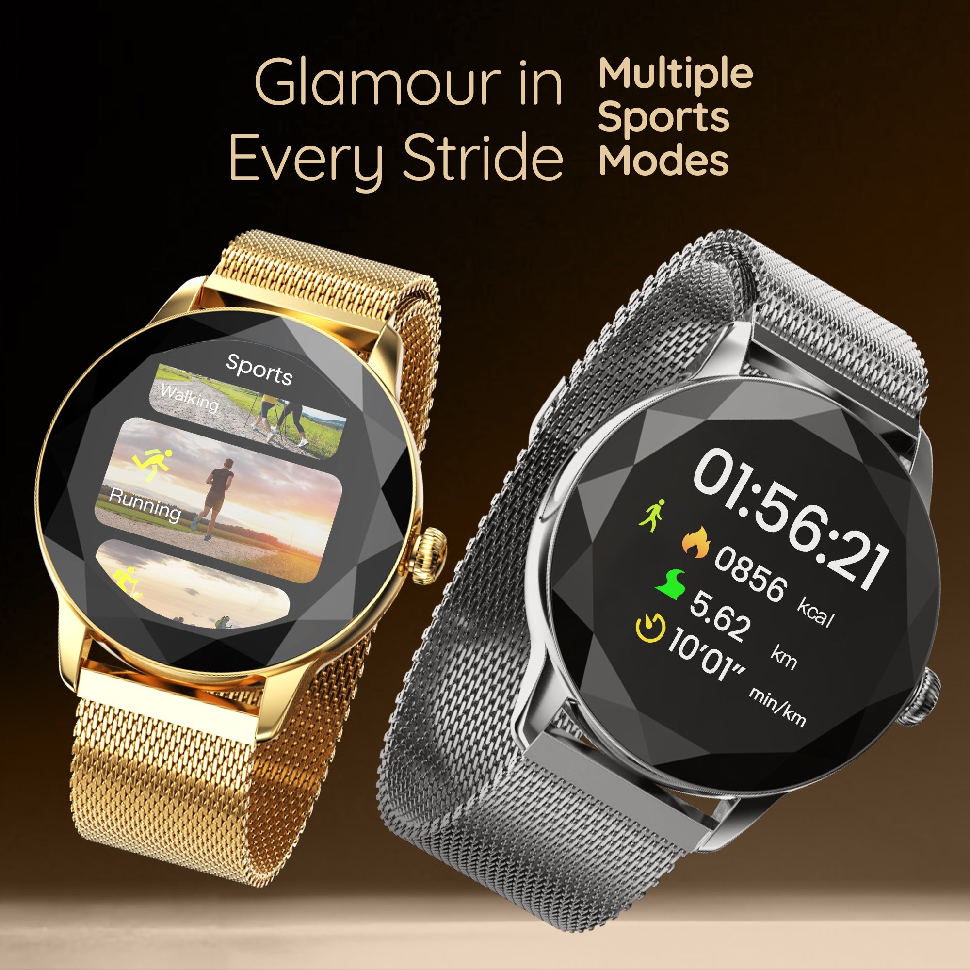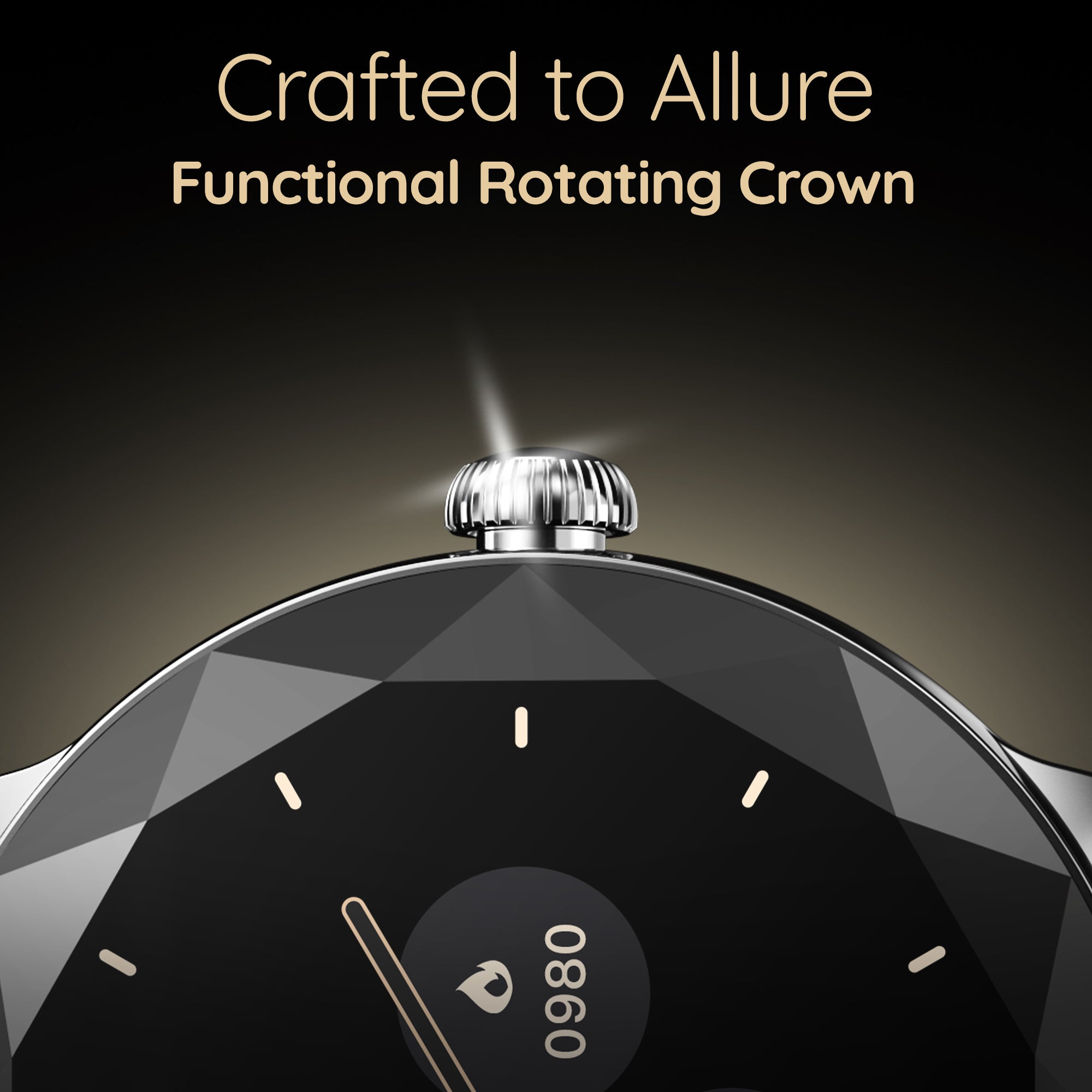 Pebble Vienna, featuring a sleek diamond-cut design and a vibrant 1.27" HD display. Stay connected with Bluetooth calling and enjoy dedicated female health monitoring alongside heart rate and sleep tracking. Engage in various sports modes and customize your watch face to suit your style. Benefit from AI voice assistance, stay organized with alarms and notifications, and plan your days efficiently with the smart calendar. Additionally, stay updated on the go with real-time weather information, ensuring you're always prepared for the day ahead.