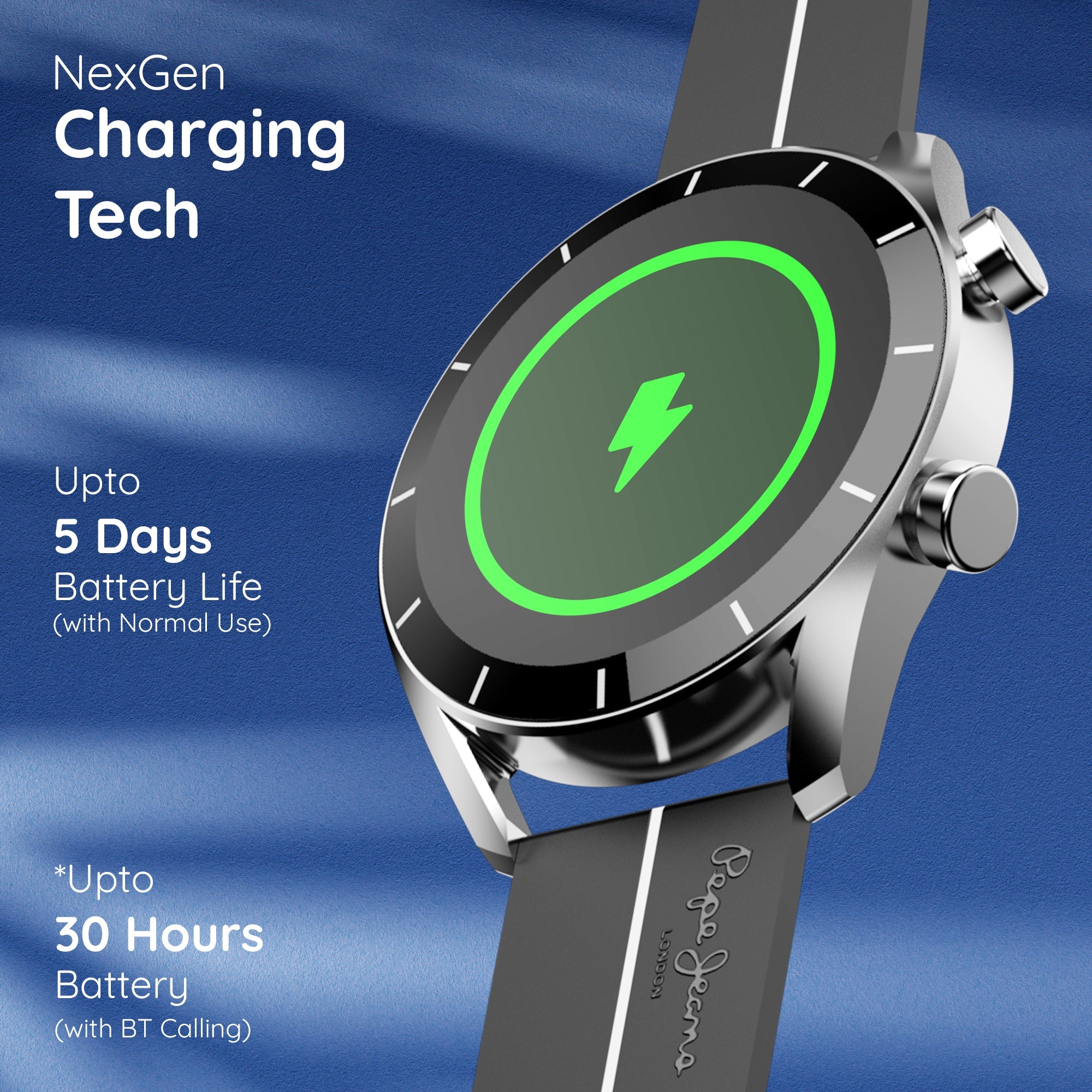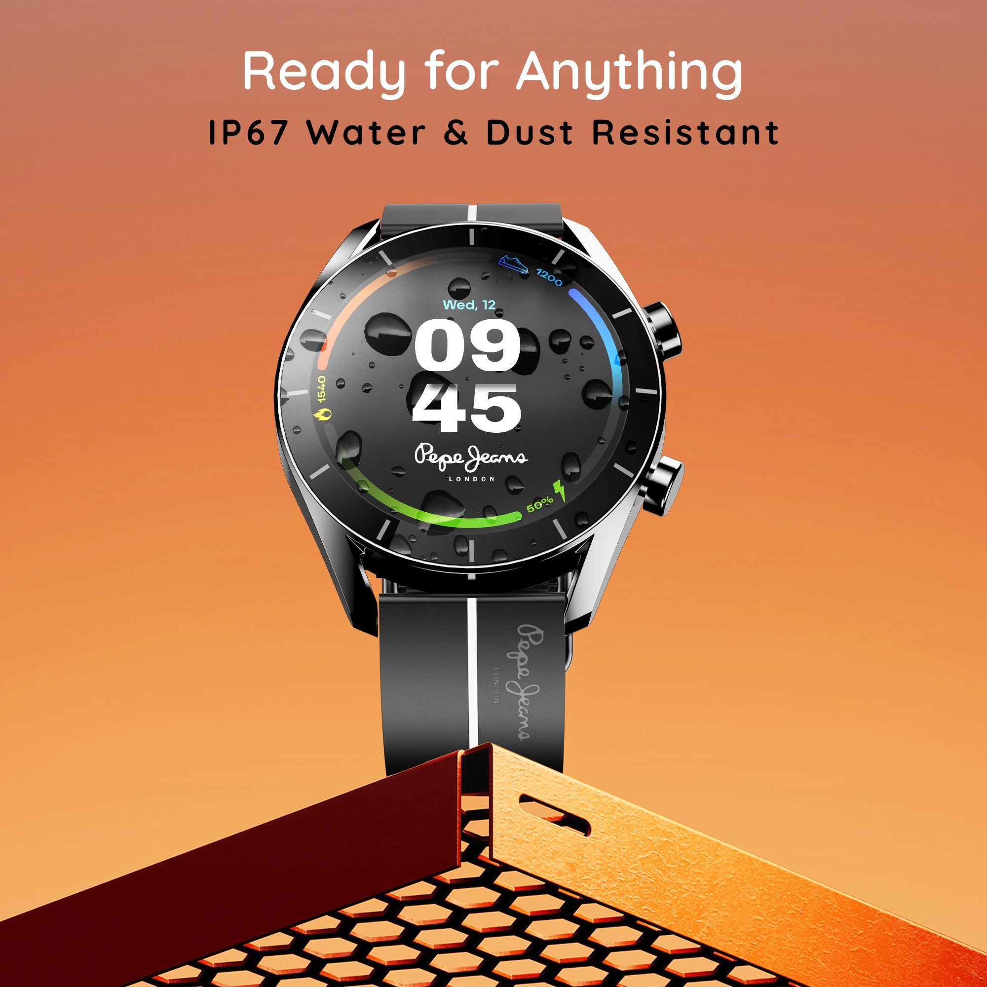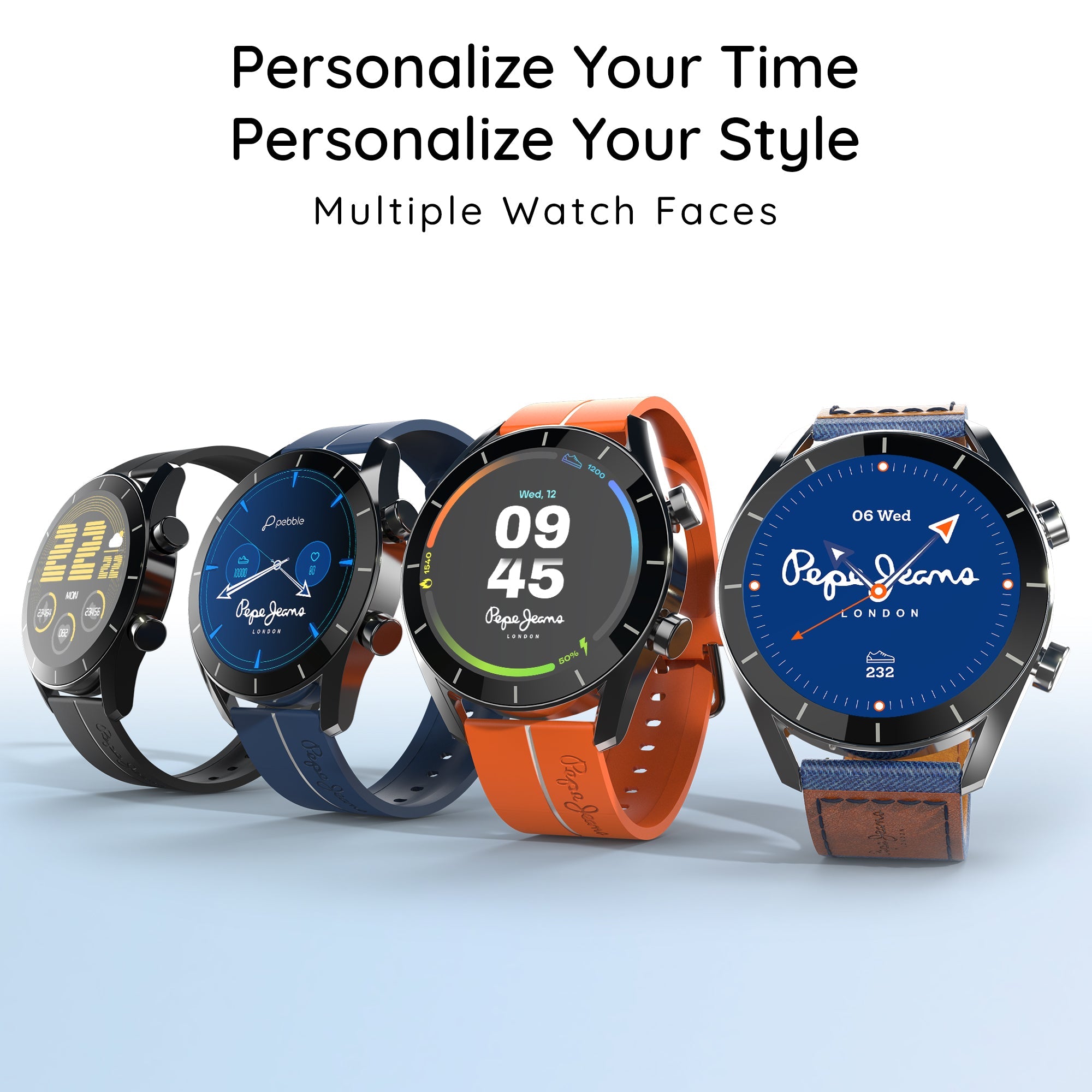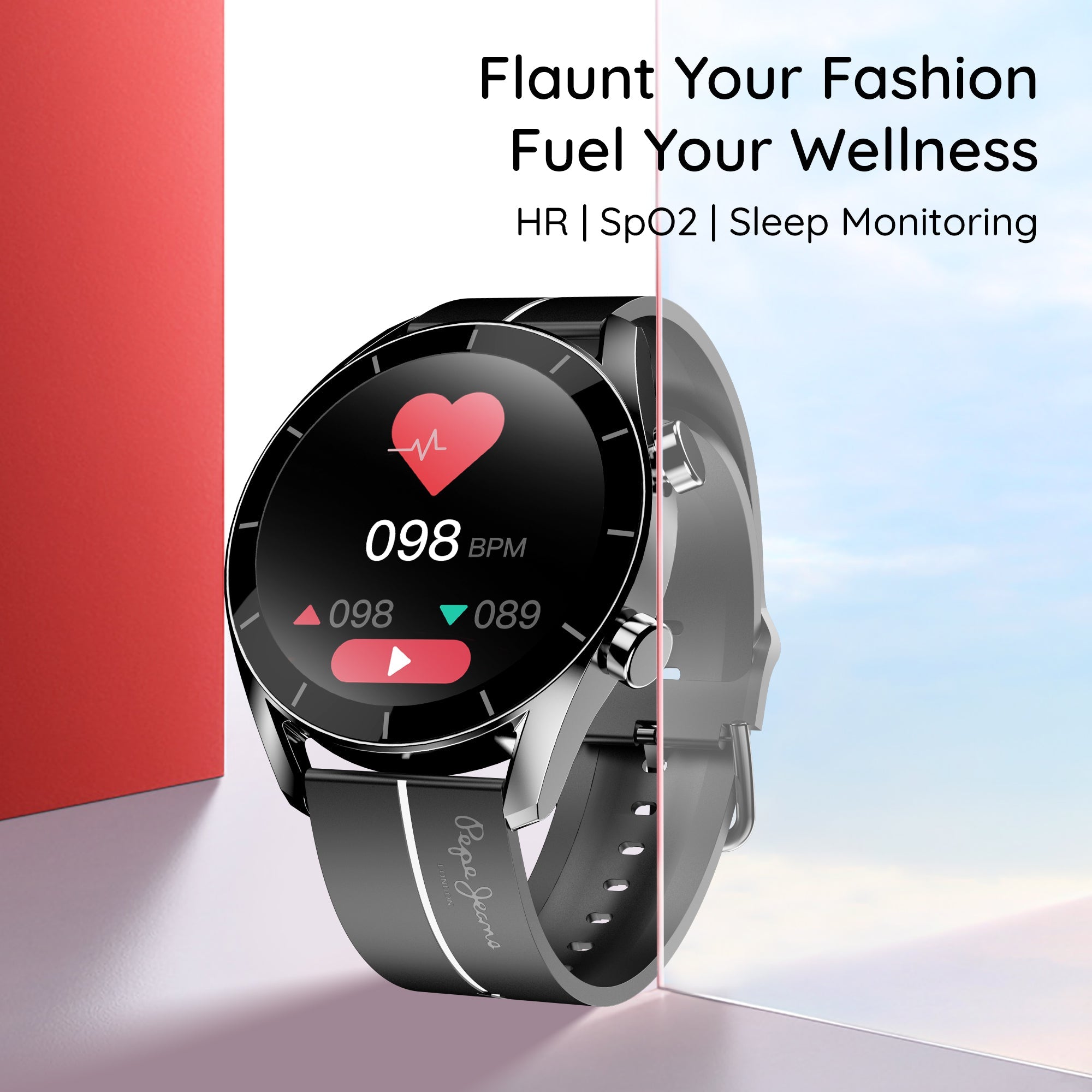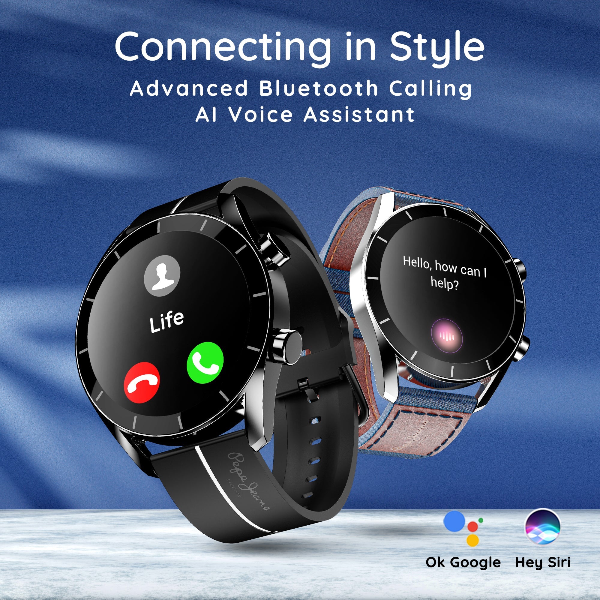 Introducing the Pebble Pepe Jeans Smartwatch with a vibrant 1.39" HD Display boasting an impressive 600 Nits brightness for crystal-clear visuals. Stay connected with BT Calling, monitor your well-being with Health Suite, and find tranquillity with Zen Mode. Track your sleep patterns, get assistance from the AI Voice Assistant, and explore various sports modes. Stay informed with alarms and notifications, simplify calculations with the Smart Calculator, and keep tabs on your steps with the Step Pedometer. Crafted with a sleek Metal Alloy design, it's your ultimate smart companion for a dynamic lifestyle.
