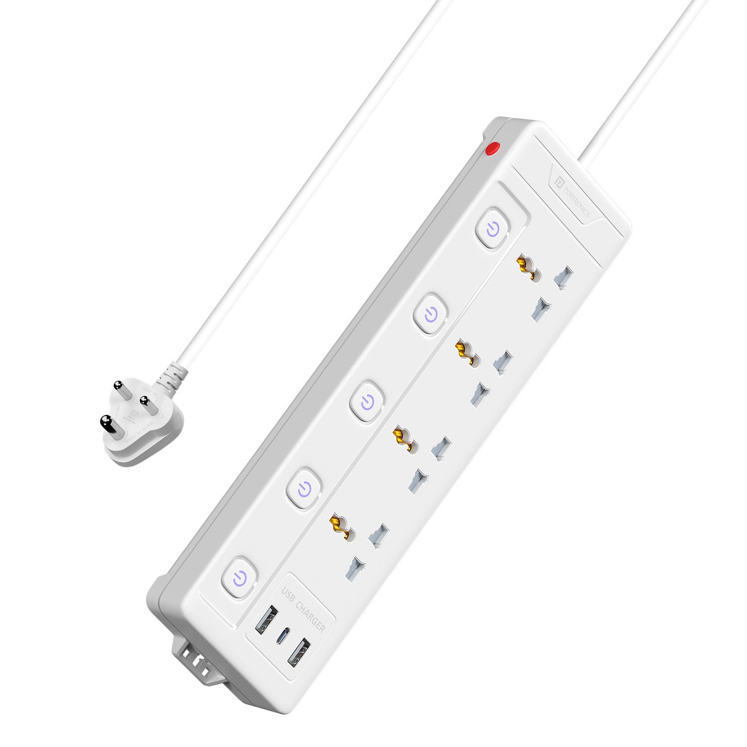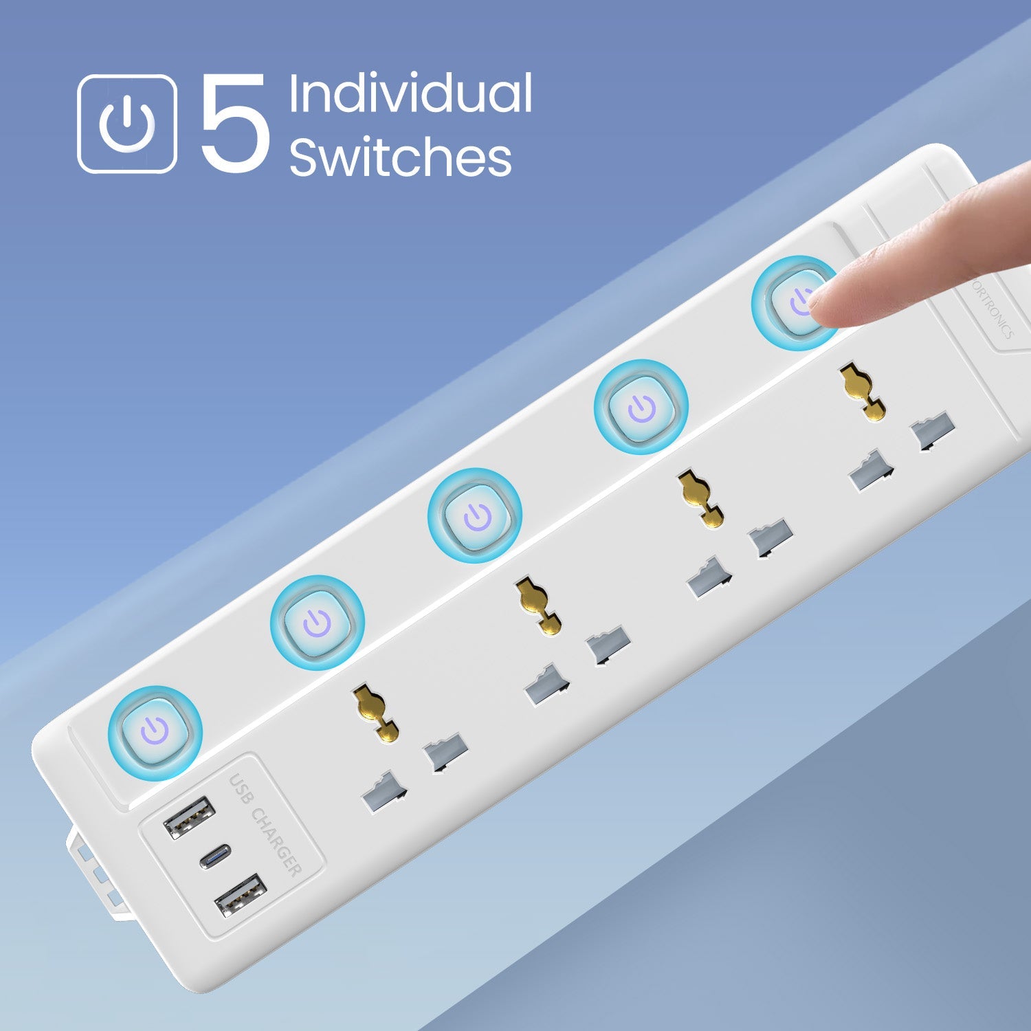 • Individual Switches for Control: Individual switches for each power socket and a dedicated switch for USB ports, allowing for customizable power management.