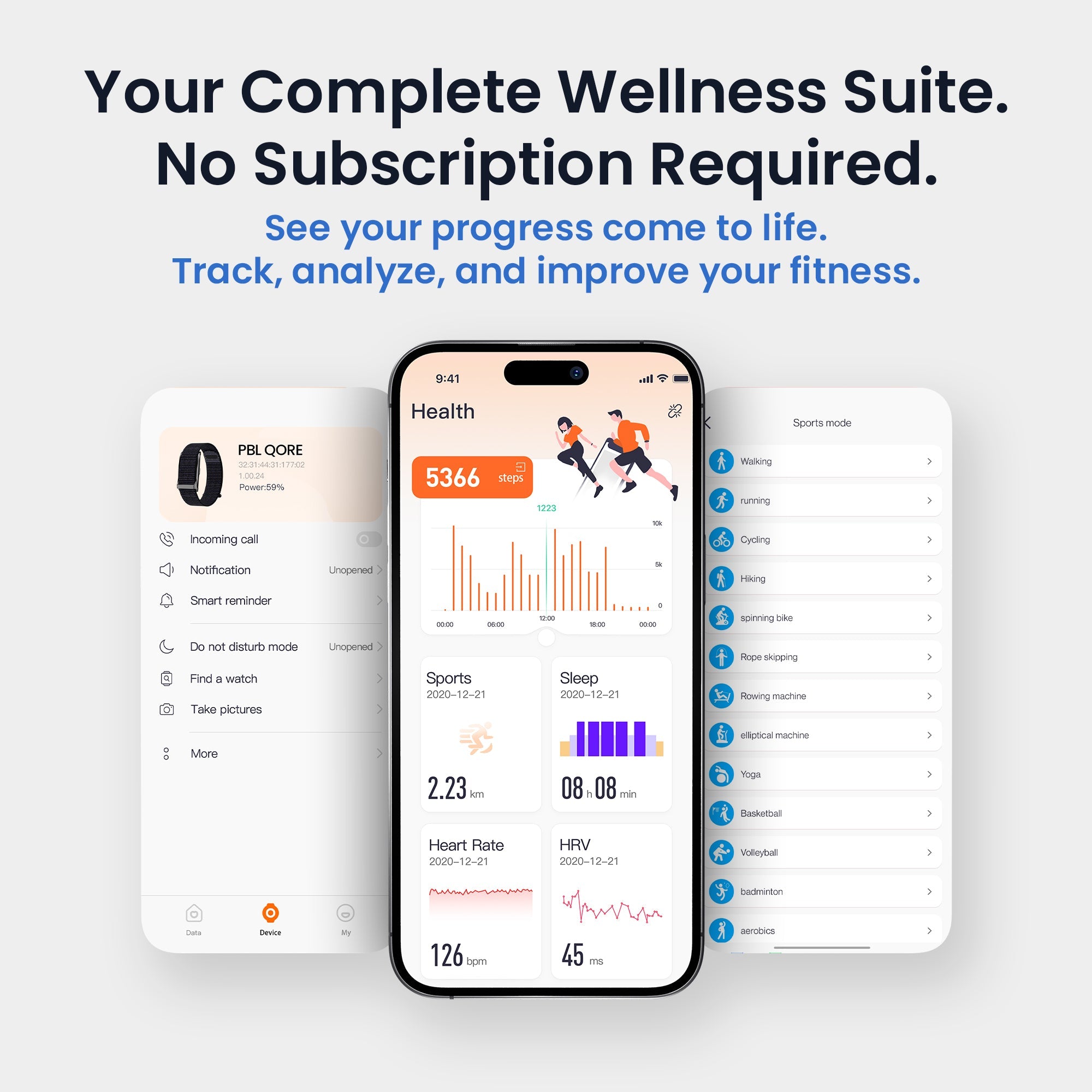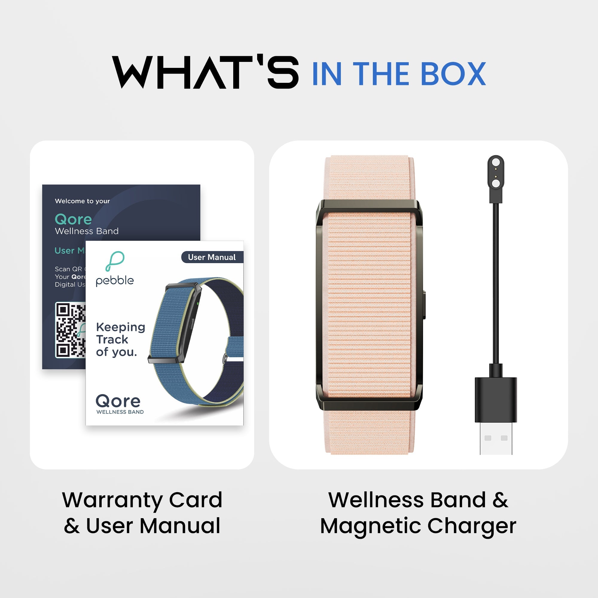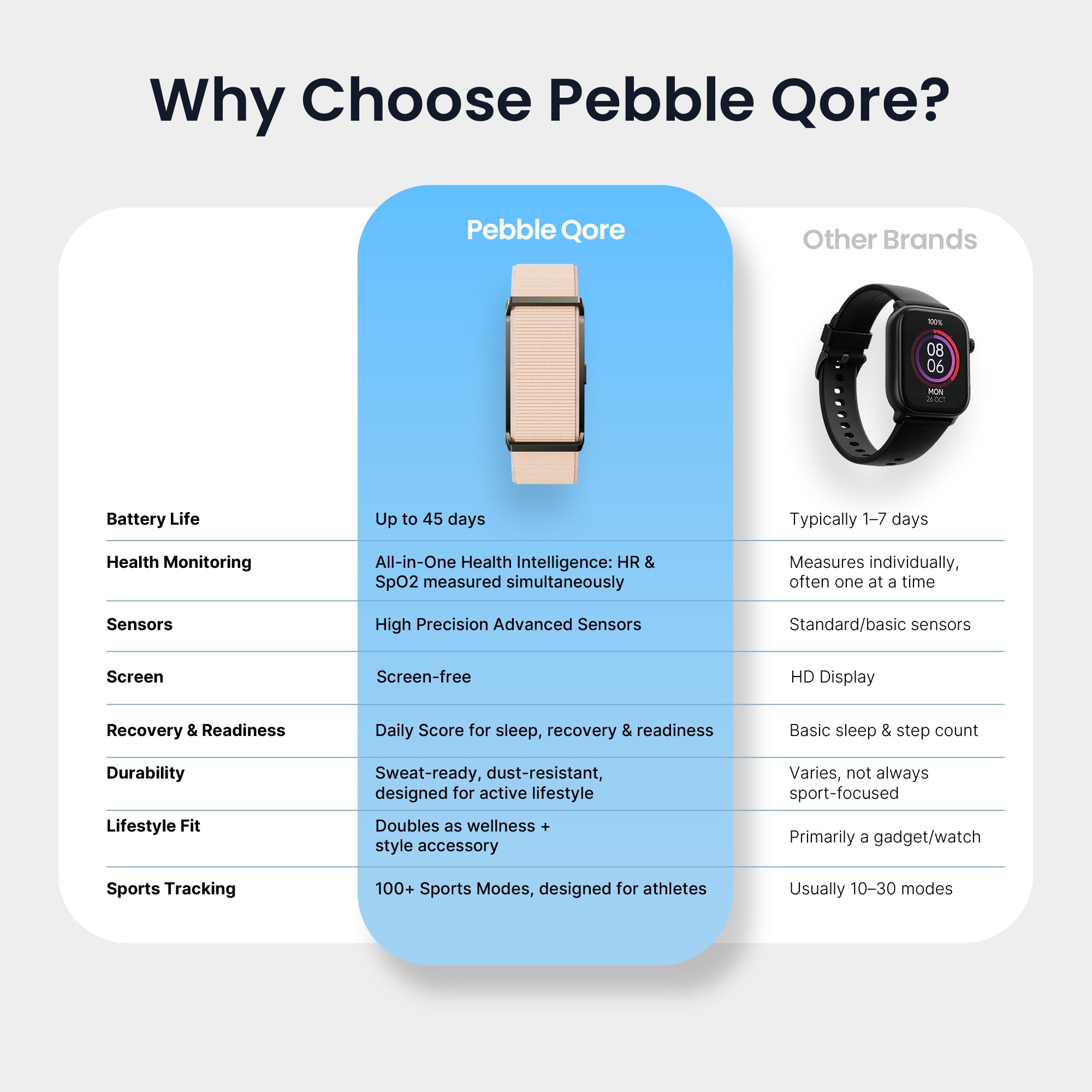 Stay on top of your fitness journey with the Pebble Qore Fitness Band| designed for performance| style| and long lasting comfort Packed with advanced health sensors| 100+ sports modes| and up to 45 days of battery life| it’s the perfect companion for workouts| daily activities| and overall wellness tracking