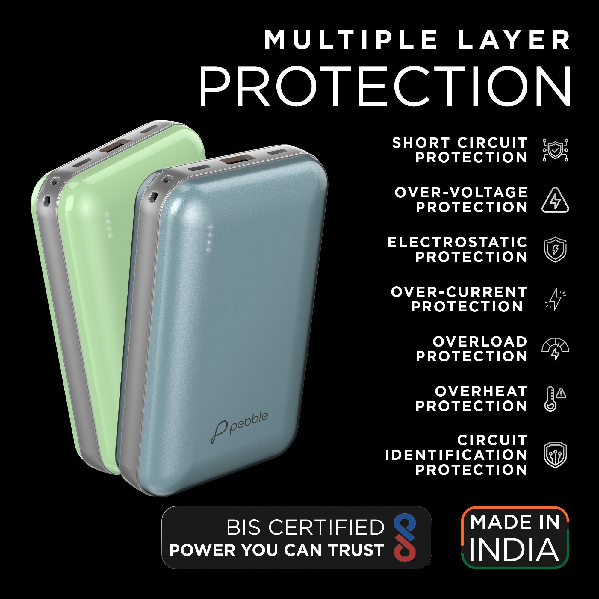 Stay powered up wherever you go with the Pebble Rapid Nova20 a high-capacity 20000mAh power bank engineered for speed, safety, and versatility. Whether you're charging your smartphone, tablet, or accessories, Nova20 delivers blazing-fast 22.5W output with dual input options (Lightning & Type-C) and dual output ports (Type-C & USB) for maximum compatibility. Its sleek, compact design fits effortlessly into your bag or pocket, while the LED indicator keeps you informed of battery levels. Built with advanced 10-way circuit protection, Nova20 ensures safe charging every time protecting against overcharge, short circuit, overheating, and more. Perfect for travel, work, or daily use, Pebble Rapid Nova20 is your reliable backup power companion.