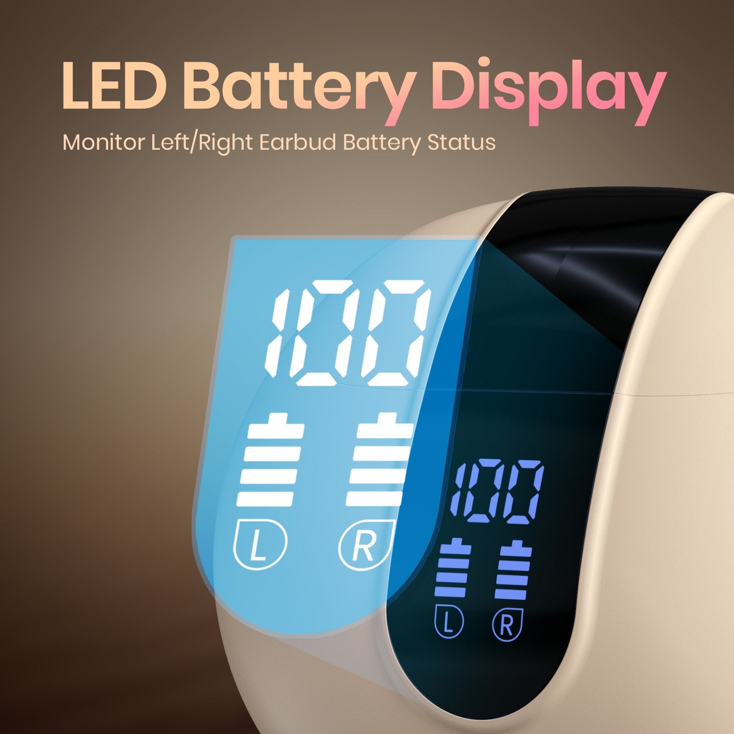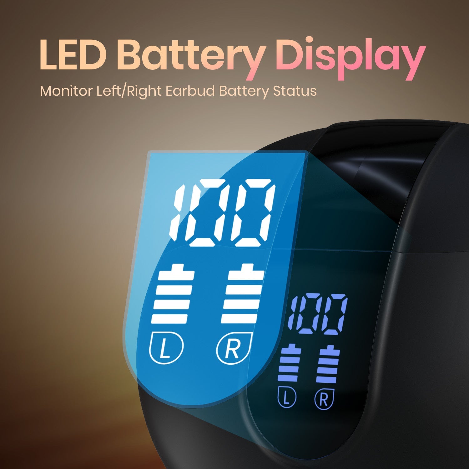 - Digital Battery Display Case – Know your charge at a glance with the smart LED digital display that shows the exact battery levels of both the earbuds and the charging case.