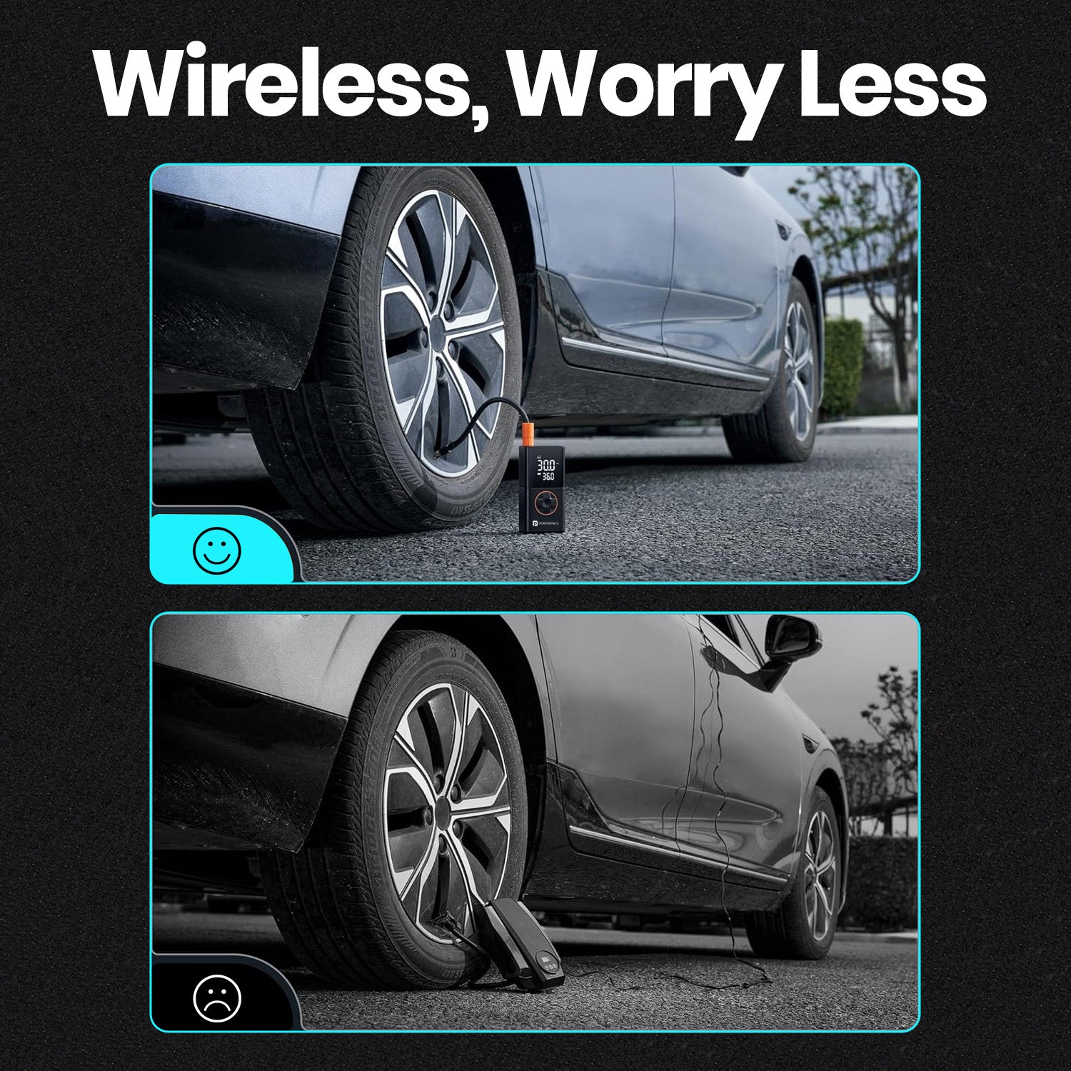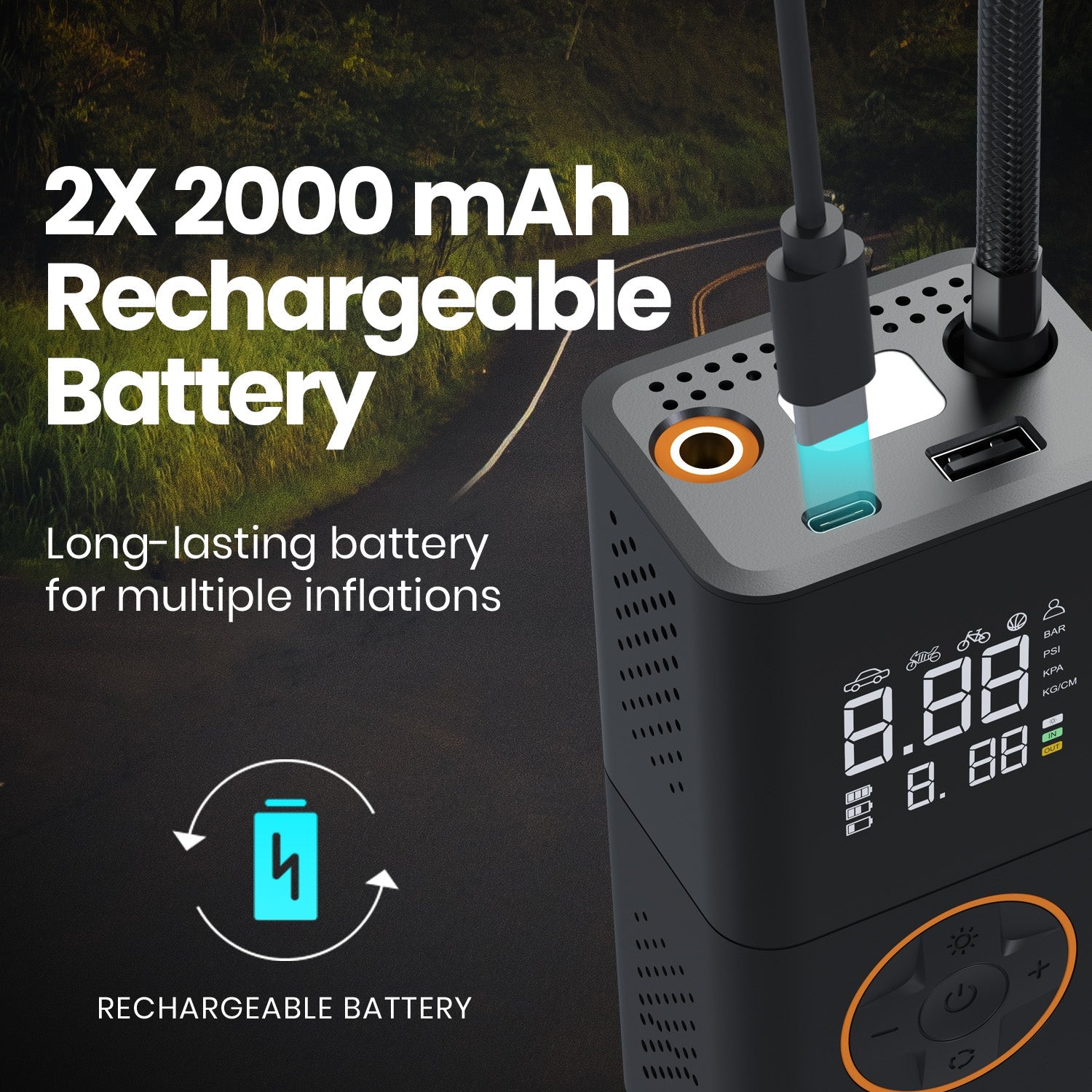 - 2 X 2000 mAh Rechargeable Batteries:: The Portronics Vayu 3.0 portable tyre inflator for cars, bikes and cycles ensures long-lasting power. Its rechargeable battery allows multiple uses, making it an essential part of your car accessories kit.