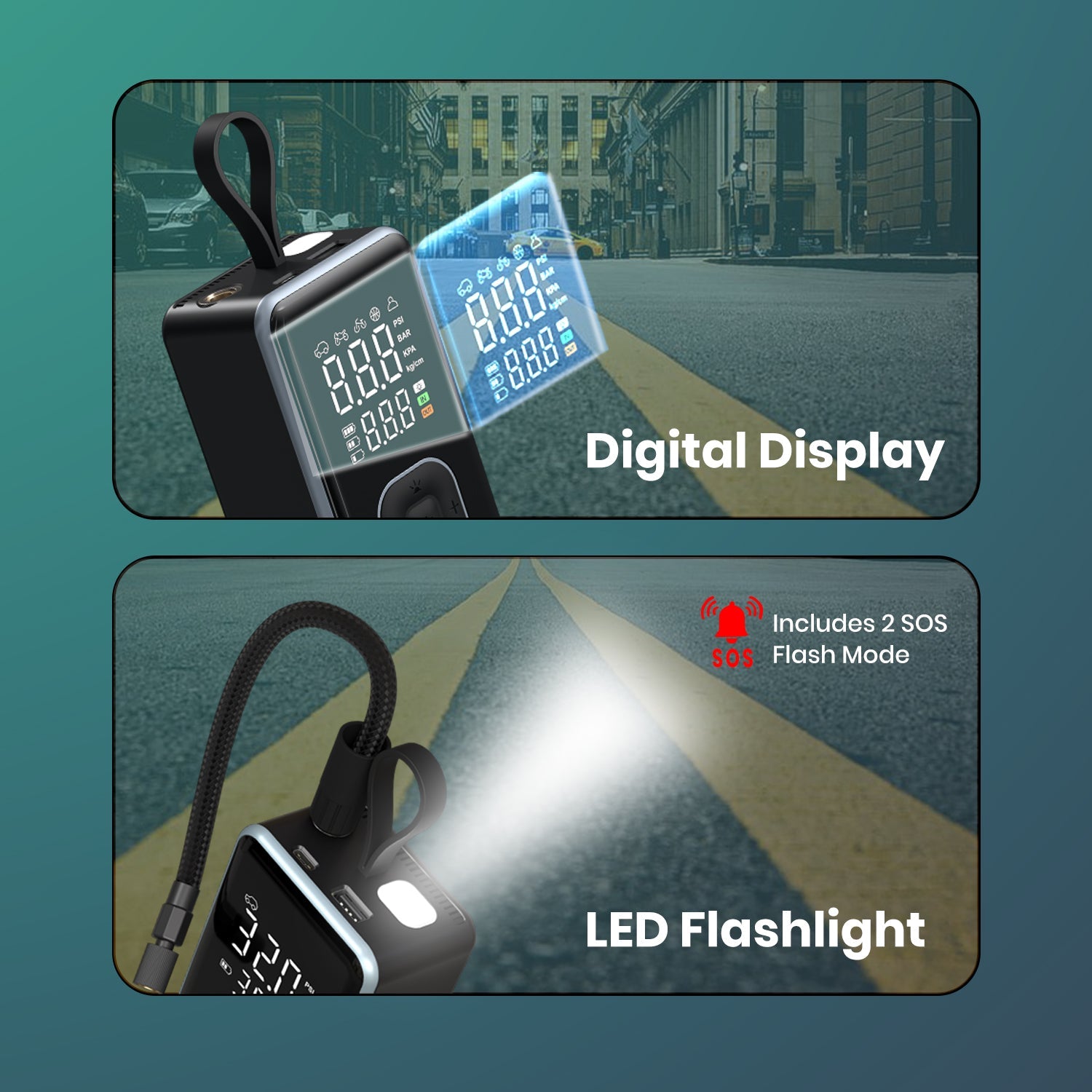 • LED Light Torch with SOS : Built-in LED torch enhances visibility in dark or low-light environments, making night-time inflations safe and convenient.